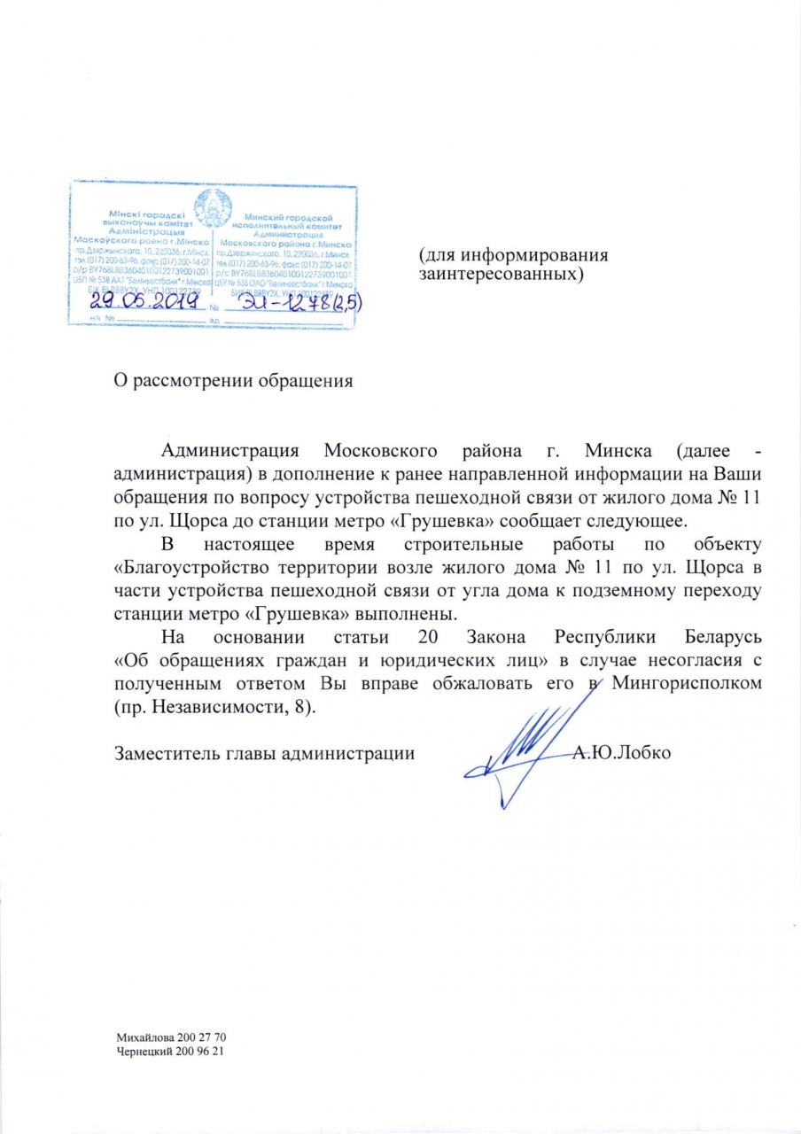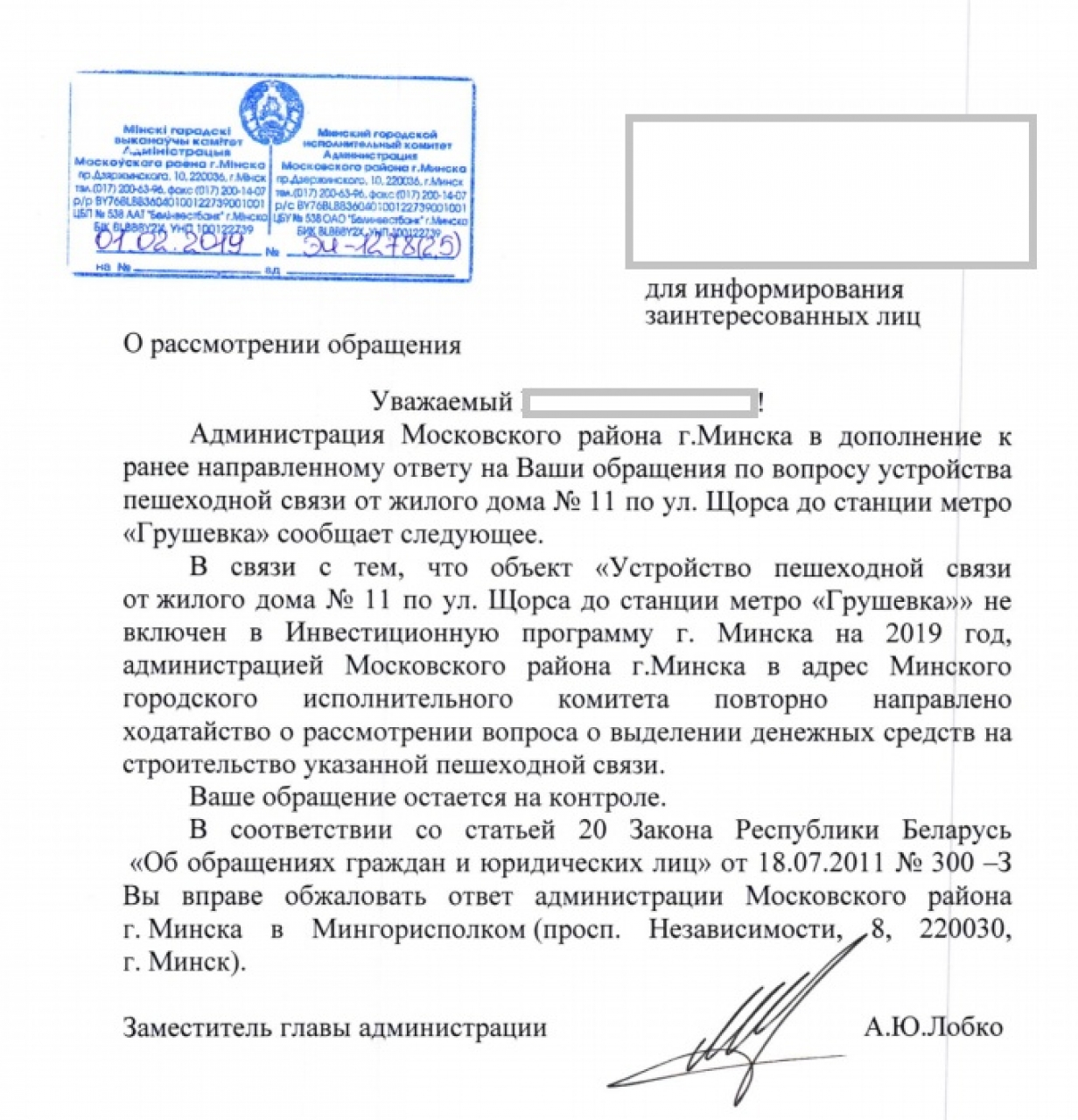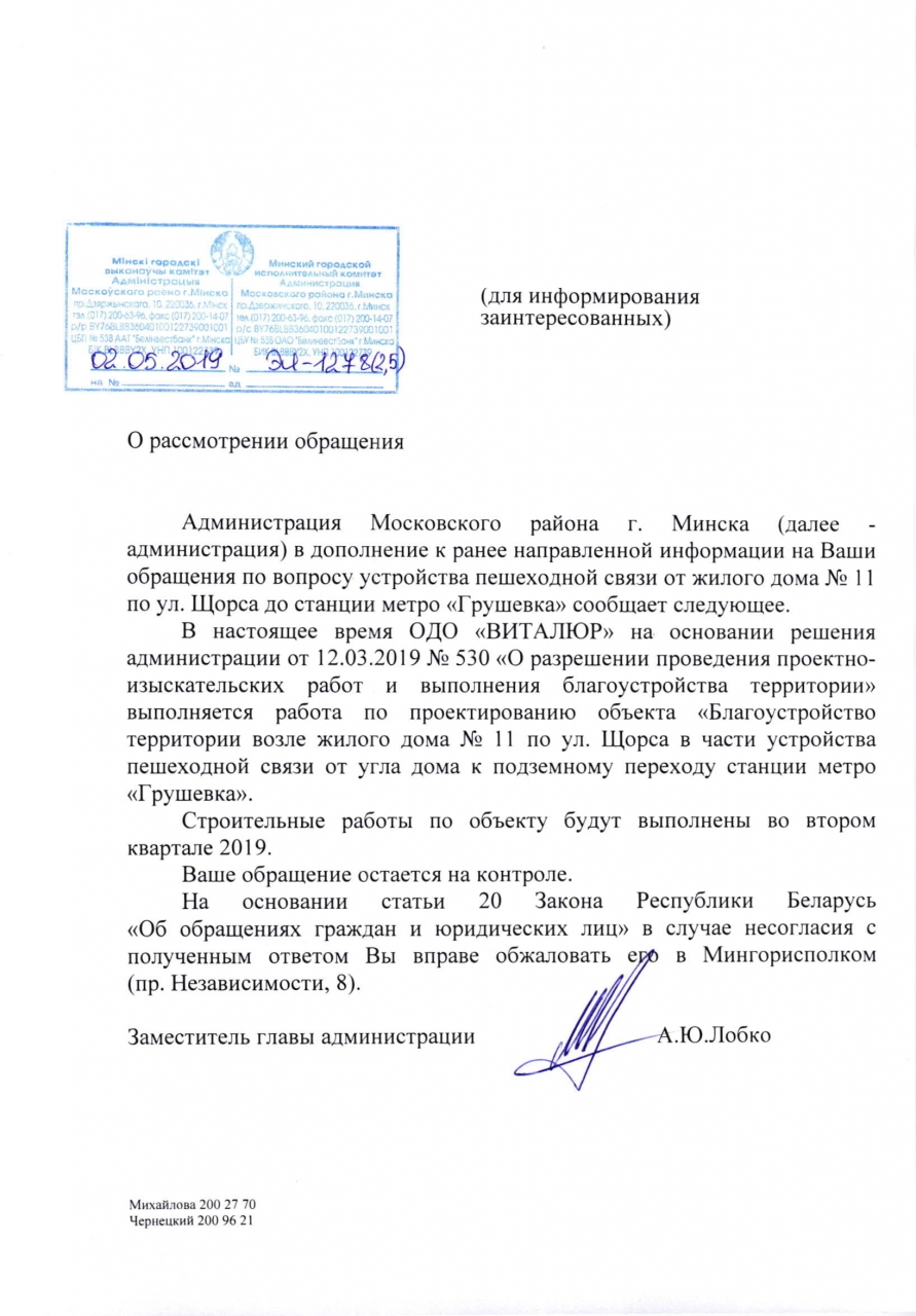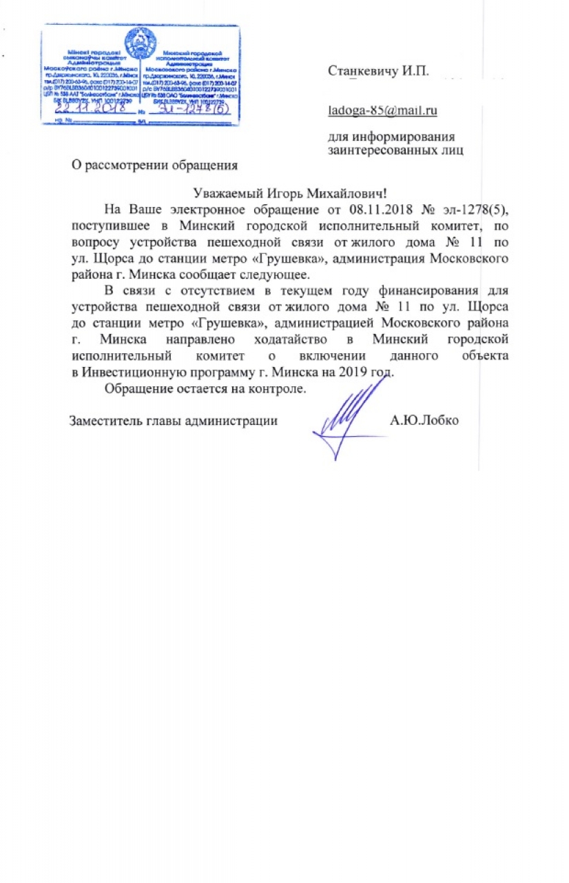 - включить в инвестиционную программу на 2019 год обустройство пешеходной дорожки от подземного перехода по проспекту Дзержинского (ст.метро "Грушевка") к дому по ул. Щорса, 11 и проинформировать нас о принятом решении;
