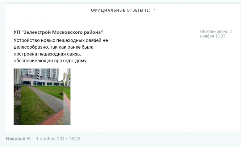 22 ноября 2018 получен ответ на наше электронное обращение (копия прилагается). Второй год подряд мы просим осуществить строительство пешеходной связи возле дома №11 по ул Щорса до ст. метро "Грушевка". Второй год подряд нам отвечают, что в текущем году средств на строительство дорожки у города нет и обещают включить строительство в инвестиционную программу в следующем году. Однако, нет никакой гарантии, что наше требование будет выполнено и в 2019 году.