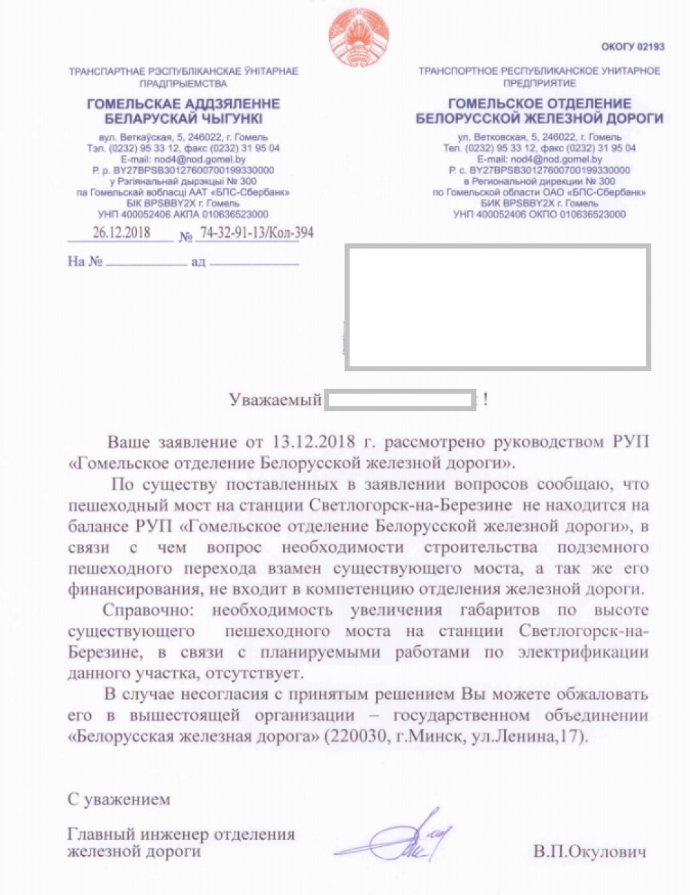 Таким образом, настоящим обращением мы просим руководство Белорусской железной дороги рассмотреть вопрос о строительстве подземного пешеходного перехода вместо пешеходного моста на станции Светлогорск-на-Березине.