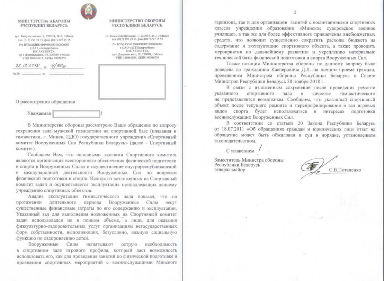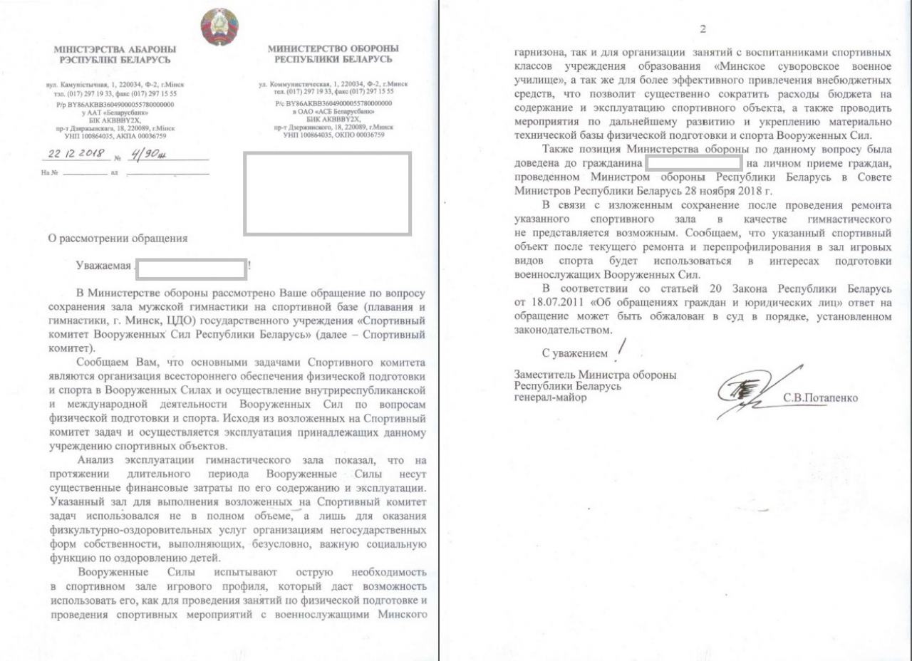 Обращение тренеров, гимнастов, а также родителей детей, занимающихся в зале спортивной гимнастики Дома офицеров, находящегося в оперативном управлении ГУ «Спортивного комитета Вооруженных сил РБ», расположенного по адресу: г. Минск, ул. Красноармейская, 3а.