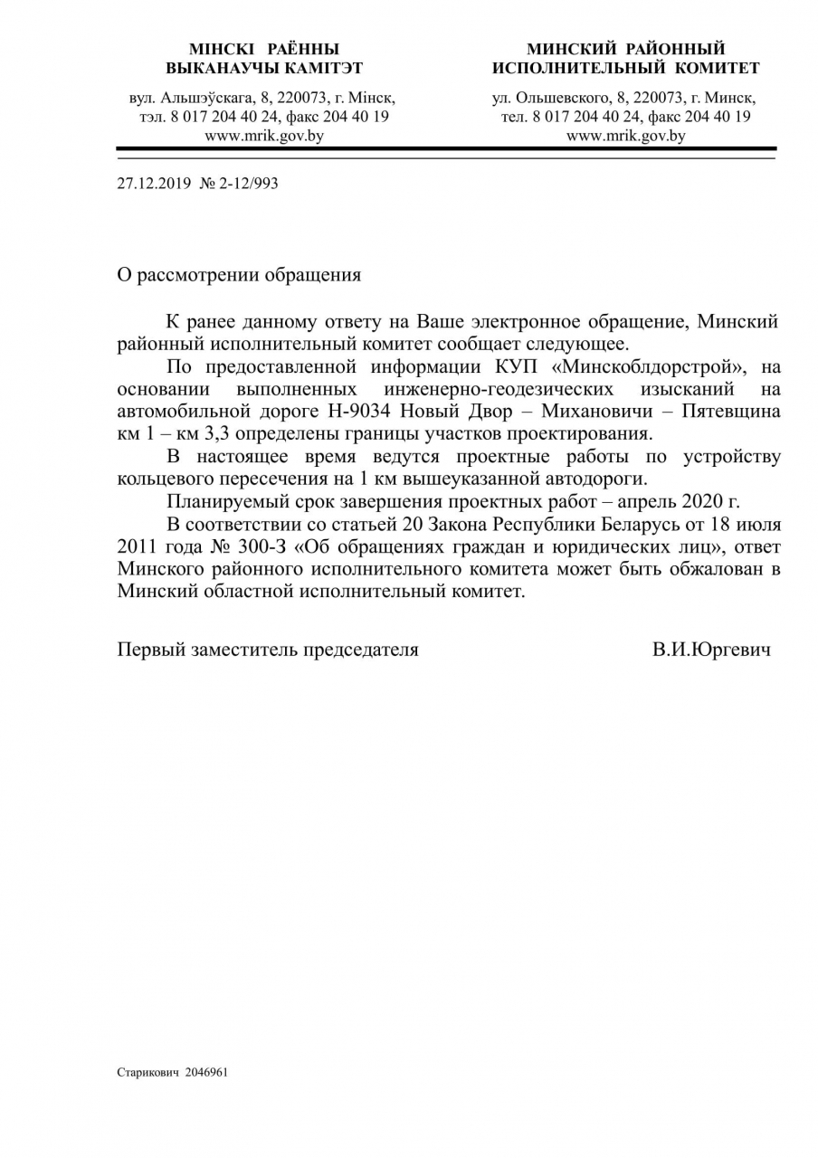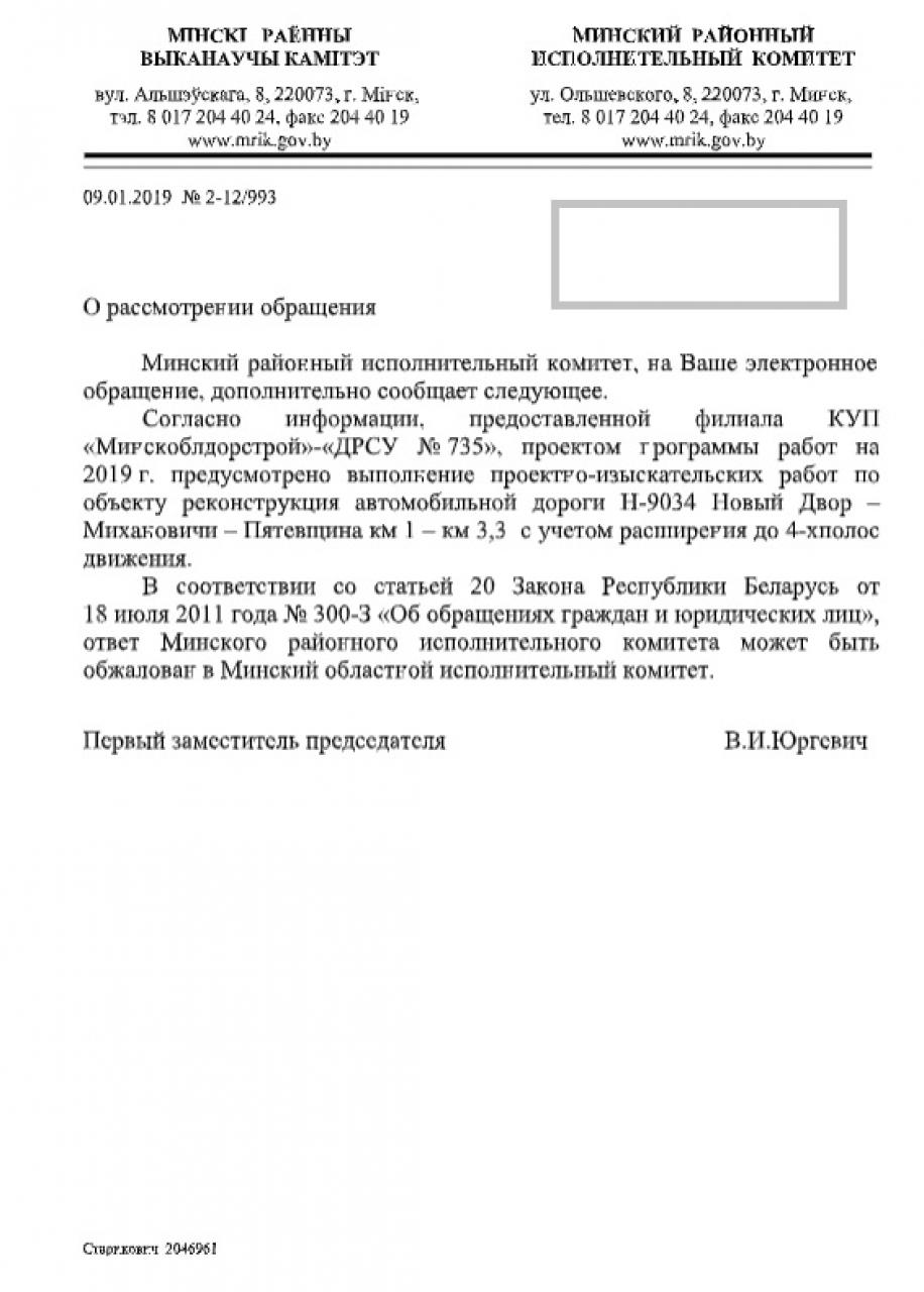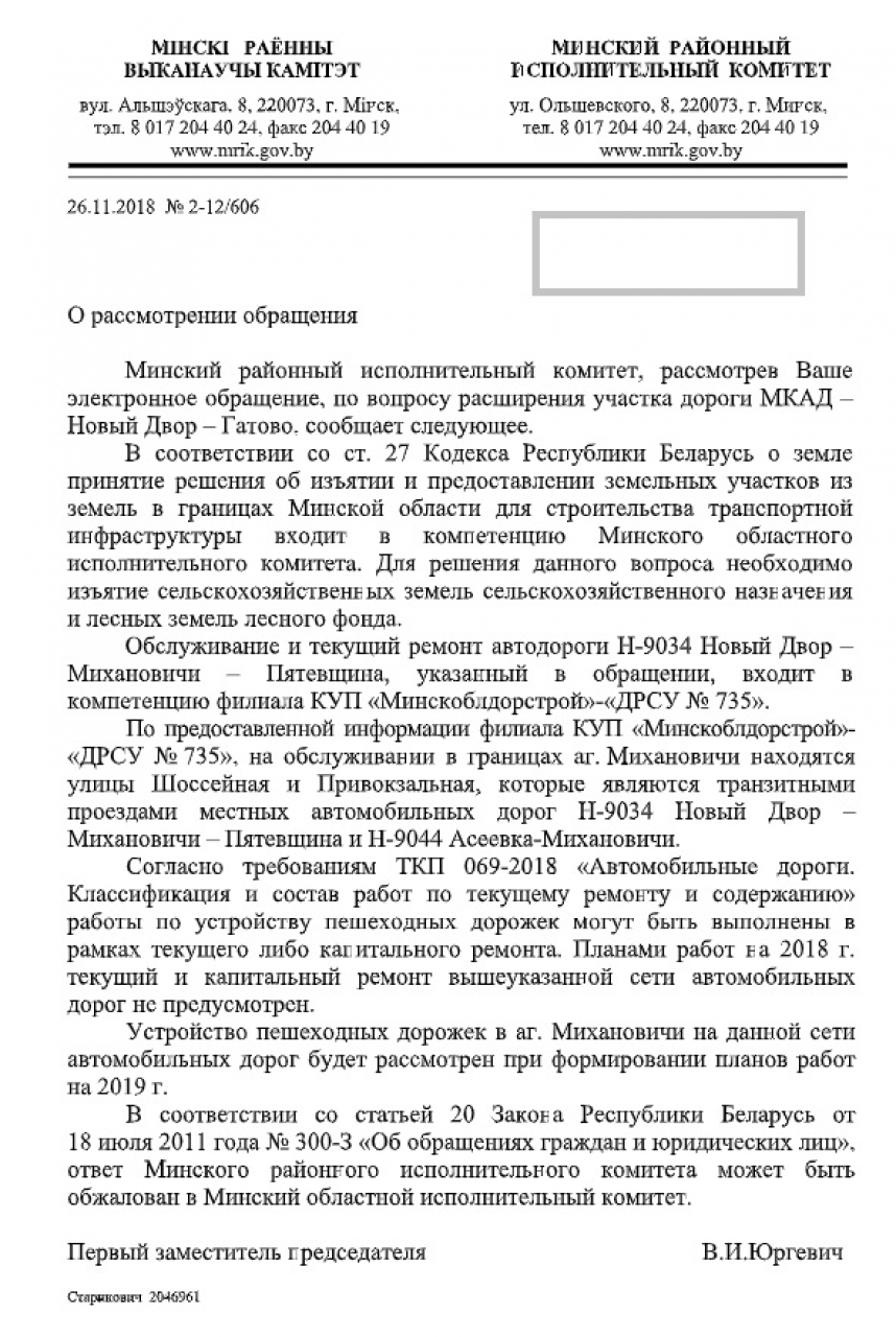 Ответ Минского райисполкома не содержит сведения о результатах рассмотрения некоторых пунктов электронного обращения. Кроме того, по нашему мнению, указанный ответ не содержит конкретных формулировок, опровергающих или подтверждающих доводы заявителей, а изложен общими фразами.