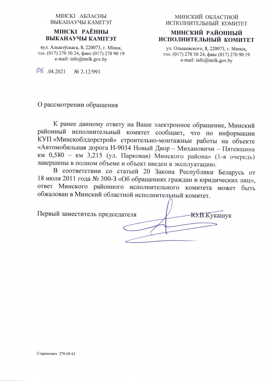 Строительно-монтажные работы на объекте "Автомобильная дорога Н-9034 Новый Двор-Михановичи-Пятевщина км 0,580-км 3,215 (ул.Парковая) Минского района" завершены в полном объёме и объект введён в эксплуатацию.