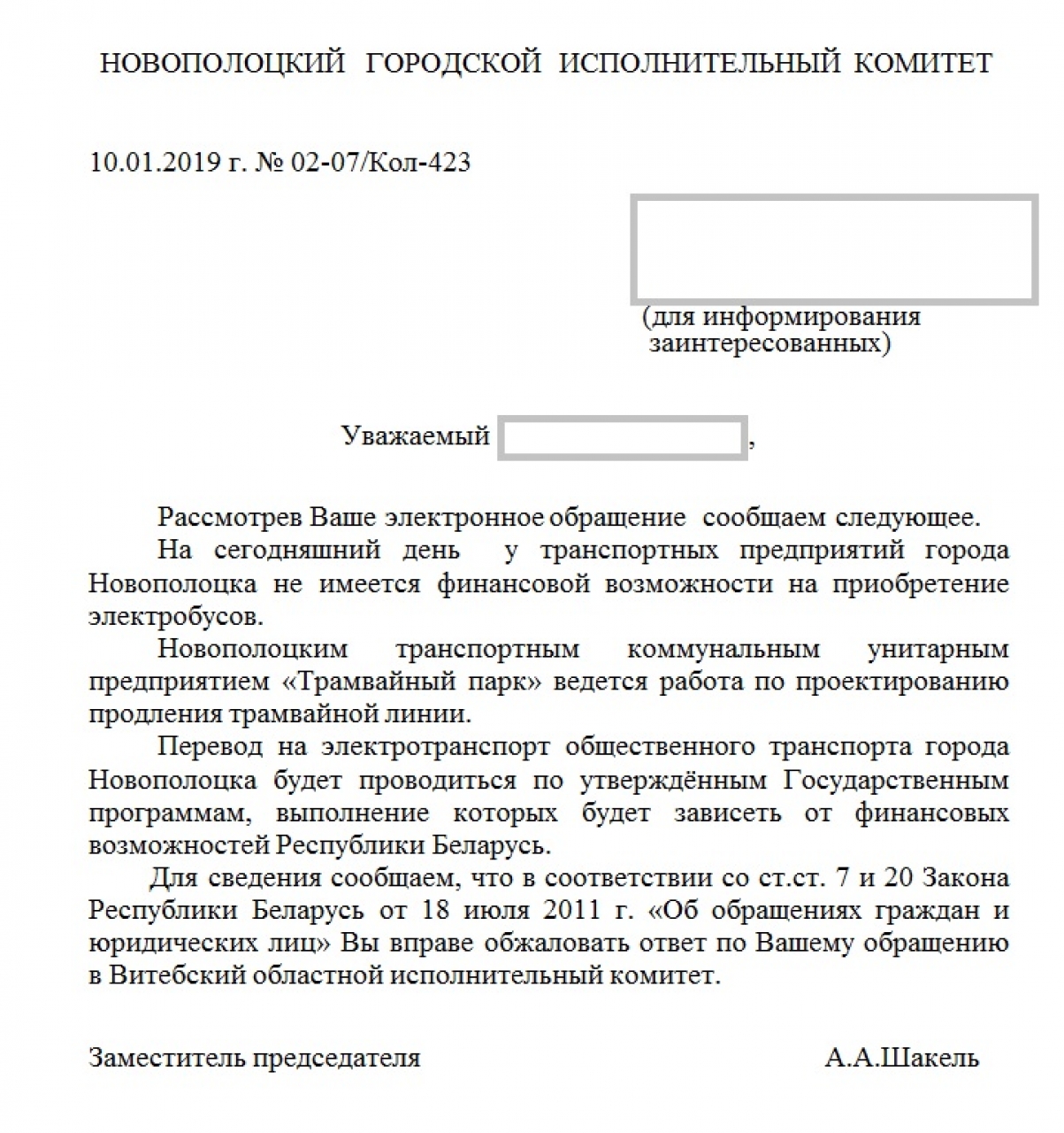 Просім разгледзець Зварот па сутнасці і даць матываваны адказ у адпаведнасці з артыкулам 12 Закона "Аб ахове навакольнага асяроддзя" і Закона "Аб зваротах грамадзянаў".