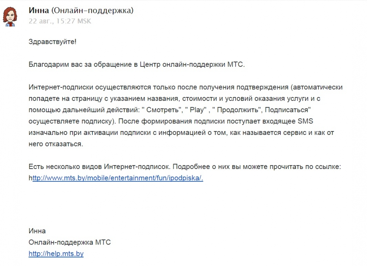 Интернет-подписки осуществляются только после получения подтверждения (автоматически попадете на страницу с указанием названия, стоимости и условий оказания услуги и с помощью дальнейший действий: " Смотреть", " Play" , " Продолжить", Подписаться" осуществляете подписку). После формирования подписки поступает входящее SMS изначально при активации подписки с информацией о том, как называется сервис и как от него отказаться.