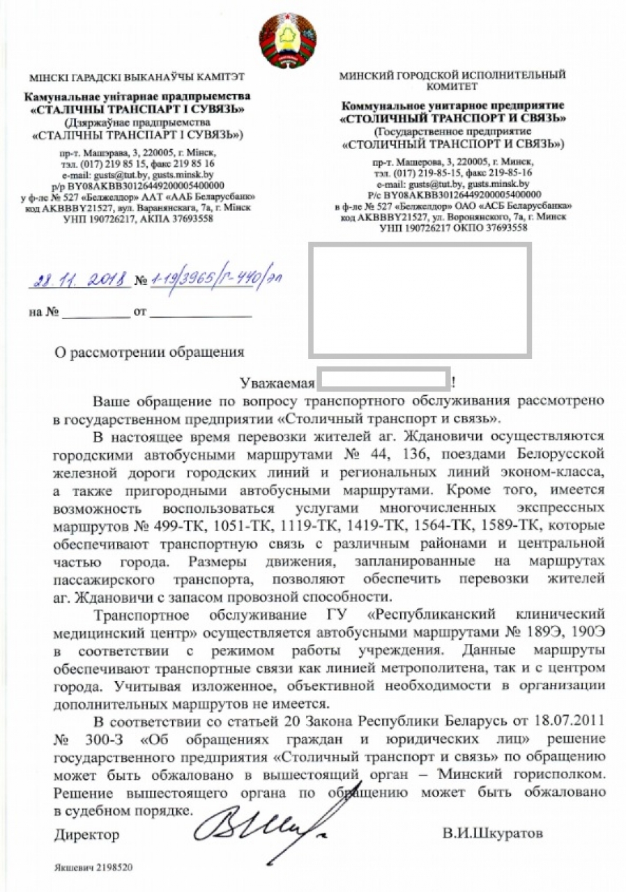 28 ноября 2018 мною получен ответ на электронное обращение (копия прилагается). Просьба, которая содержалась в обращении, состояла в том, чтобы рассмотреть возможность продлить маршрут движения автобуса 119С "Вокзал-Аквапарк" до пос.Ждановичи, а не вводить дополнительные маршруты.