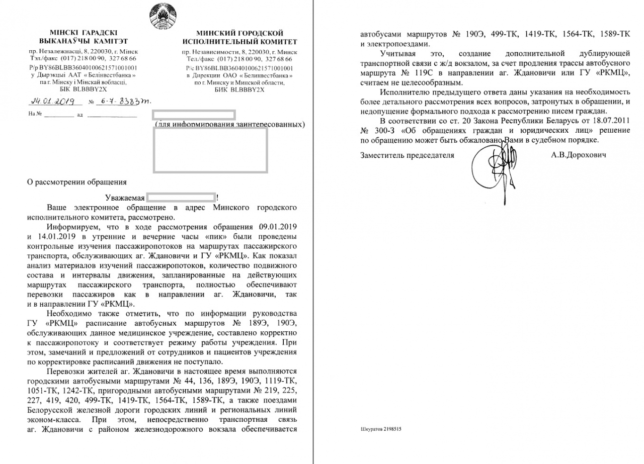 Согласно тексту обращения заявители просили рассмотреть возможность увеличения протяжённости маршрута городского автобуса №119с до ГУ "Республиканский клинический медицинский центр" и (или) до посёлка Ждановичи."
