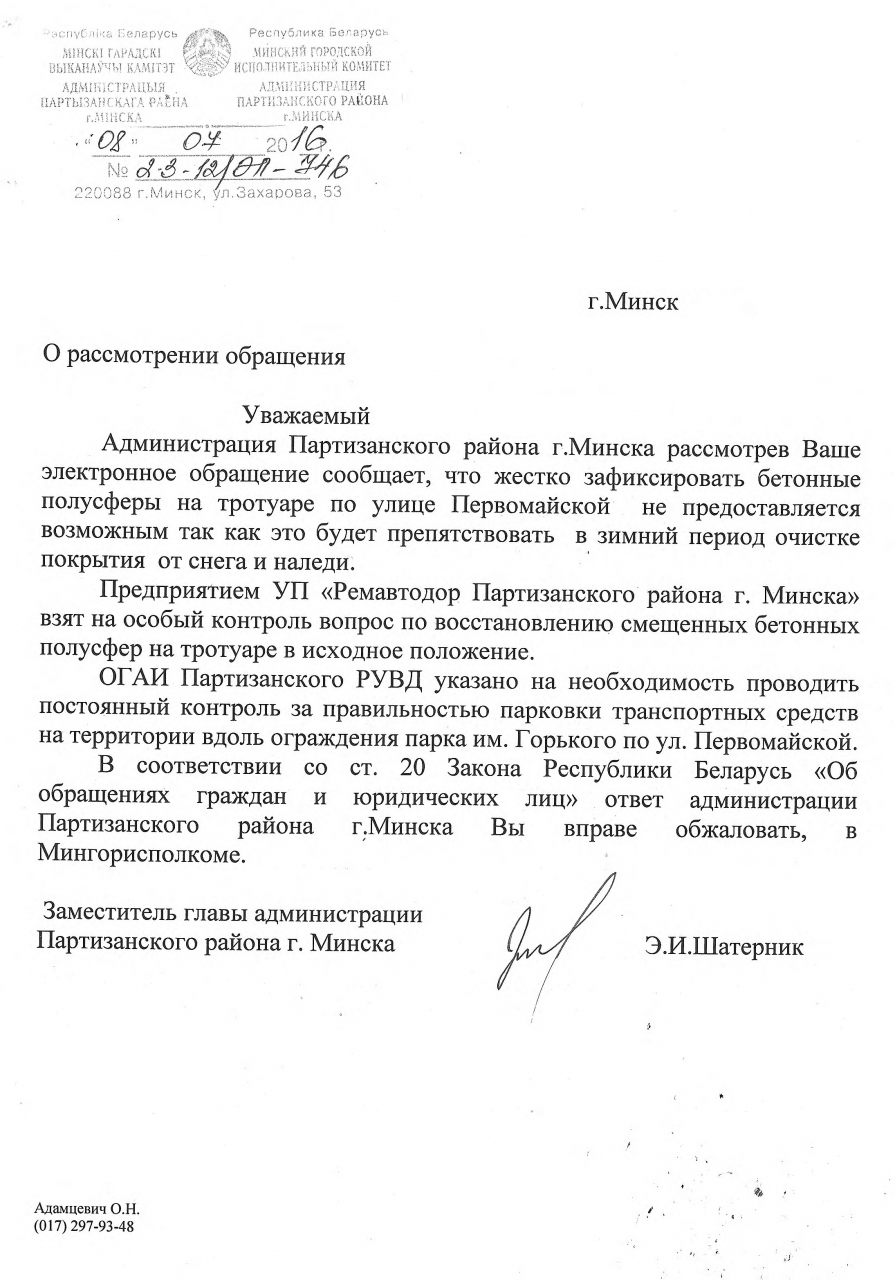 1. Просим УП «Ремавтодор Партизанского района» забетонировать либо как-либо иначе конструктивно закрепить полусферы таким образом, чтобы: (а) их было невозможно передвигать водителям по своему усмотрению (б) ширина парковки обеспечивала парковку только вдоль проезжей части, но никак не «елочкой»