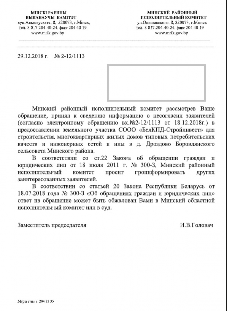 Негативно высказались граждане и относительно планируемой застройки в ходе местного собрания жителей деревни Дроздово, организованного по вашему поручению Боровлянским сельисполкомом в мае 2018 года. Граждане аргументировали свою озабоченность судьбой детской площадки, которая была построена с разрешения властей за счет средств жителей.
