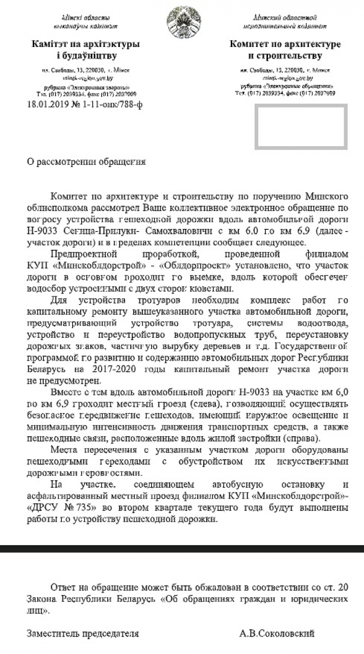 25 октября 2018 мною получен ответ на электронное обращение (копия прилагается). Cогласно данному ответу Минского райисполкома филиалом КУП "Минскоблдорстрой" ДРСУ №735 в границах аг.Прилуки предусмотрено устройство пешеходной дорожки до конца текущего года. Однако до сих пор работы по устройству дорожки не начаты, а указанный ответ я считаю отпиской, так как в нём отсутствуют даже начальные этапы работ по благоустройству дороги.