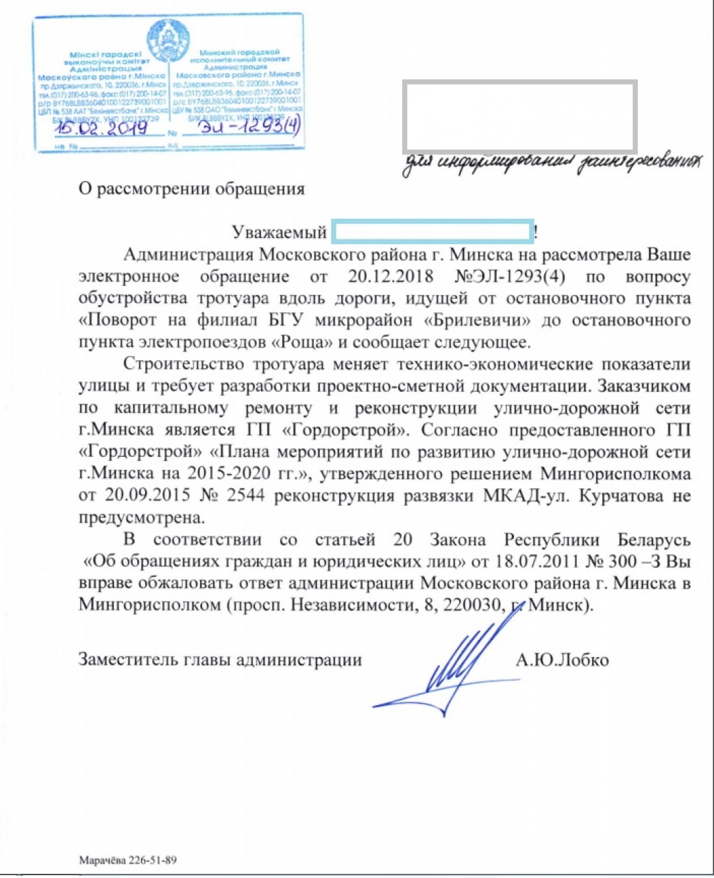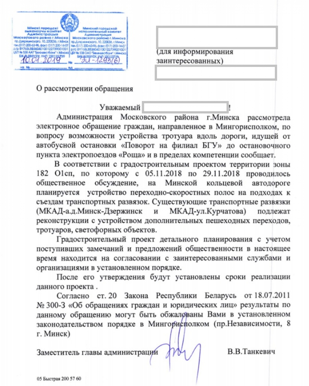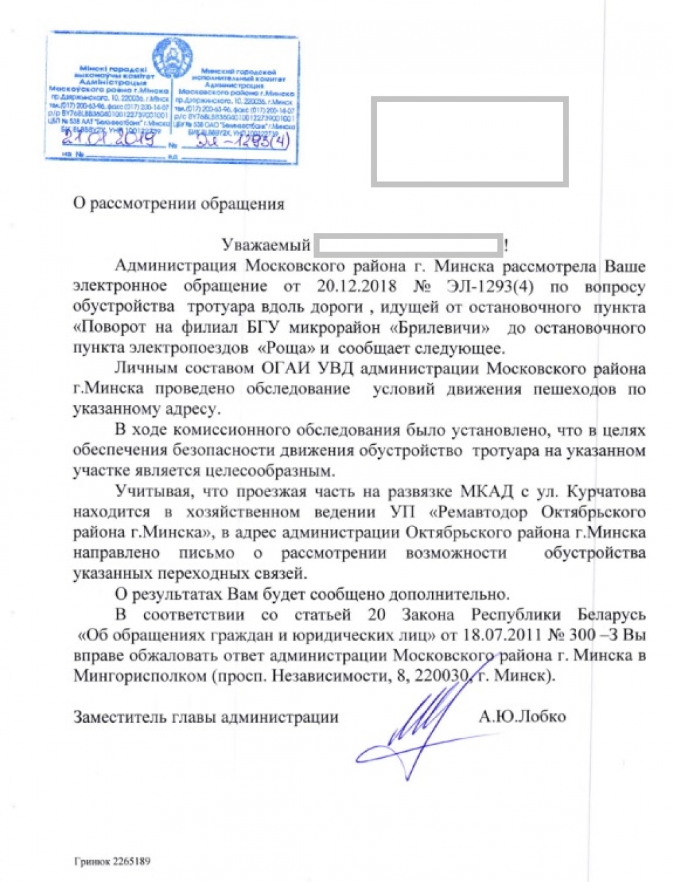 Просьба сделать тротуар вдоль дороги, идущей от автобусной остановки "Поворот на филиал БГУ" (микрорайон "Брилевичи", г.Минск) до остановочного пункта электропоездов "Роща".