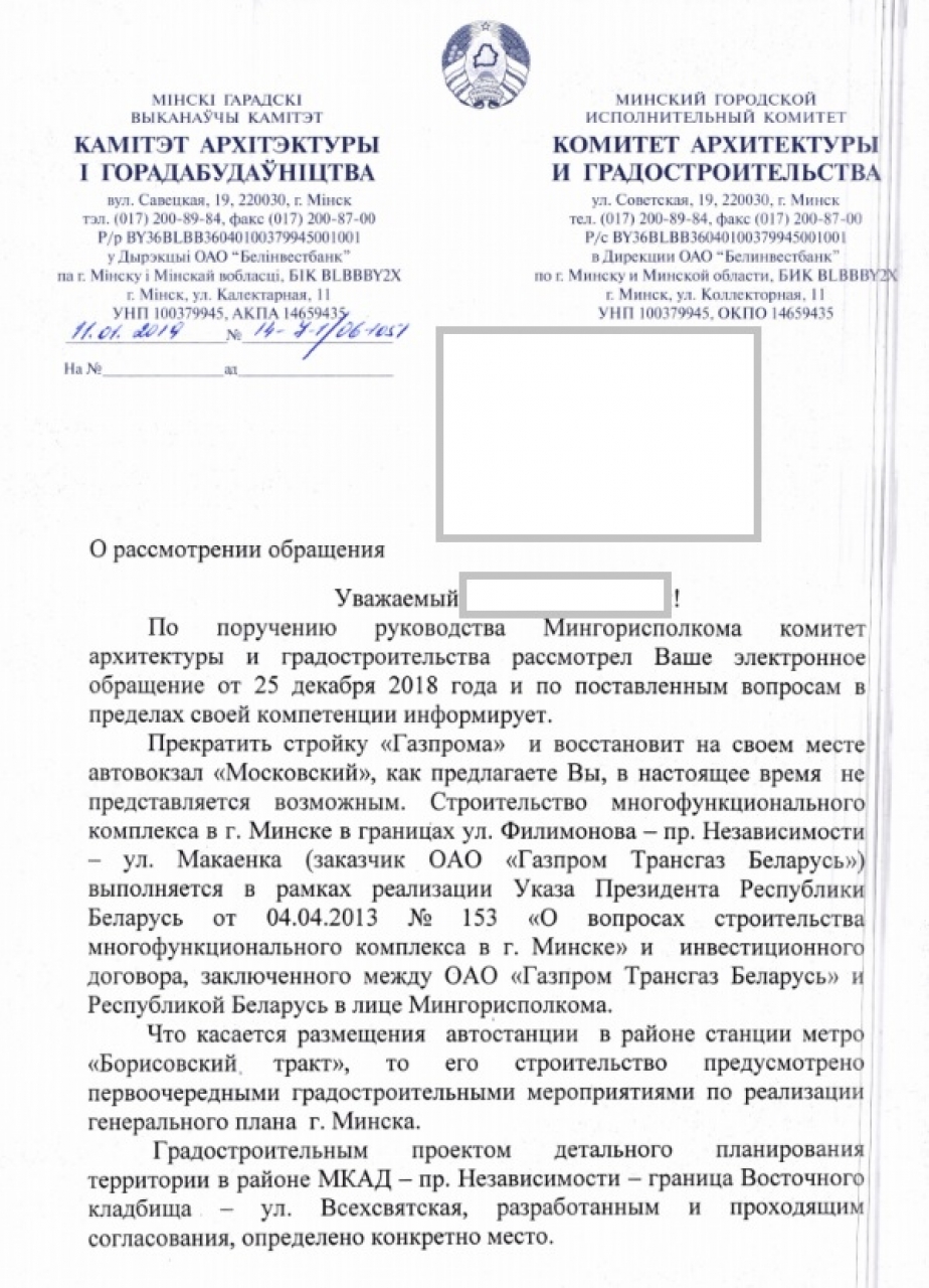 - прекратить стройку "Газпрома" и восстановить на своём месте автовокзал "Московский", либо возвести здание автовокзала около станции метро "Борисовский Тракт" с такими же характеристиками, какие были присущи автовокзалу "Московский";