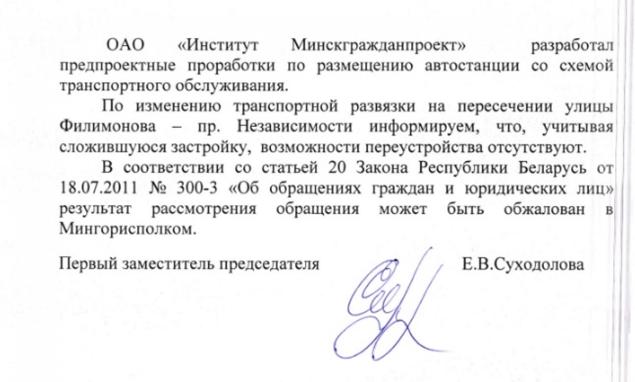 Весной 2014 года был закрыт, а позже снесен один из крупнейших транспортных узлов Минска - автовокзал "Московский". Комплекс, считавшийся одним из самых лучших в Европе, не смог устоять перед рукой российского Газпрома, который пожелал построить на его месте свой центр. Спустя четыре с половиной года работы по строительству объекта Газпрома не завершены, а законсервированы, компенсационного автовокзала нет и в планах, а развязка "Независимости-Филимонова" усугубила ситуацию в районе, отодвинув пробки на разные перекрёстки.