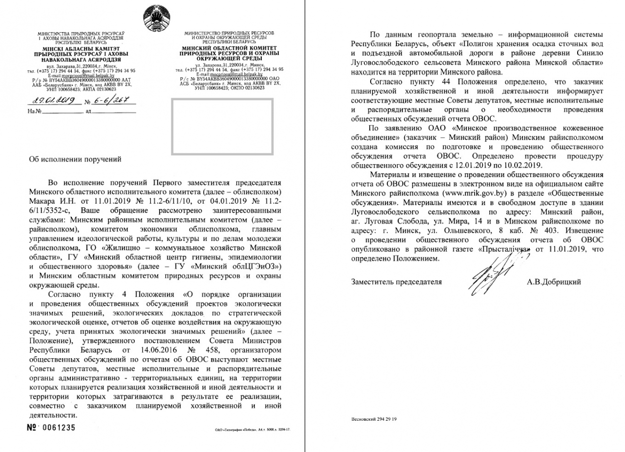 Тогда мы обратились в Минрайисполком и в ОАО «МПКО» (прилагается) с просьбой при общественных обсуждениях разместить отчёт об ОВОС, не только в Минске, где никому нет до этого дела, но и в зданиях сельсоветов, чьи территории непосредственно подвергаются влиянию строительства. И получили невнятные ответы, что для этого то ли нет оснований, то ли полномочий.