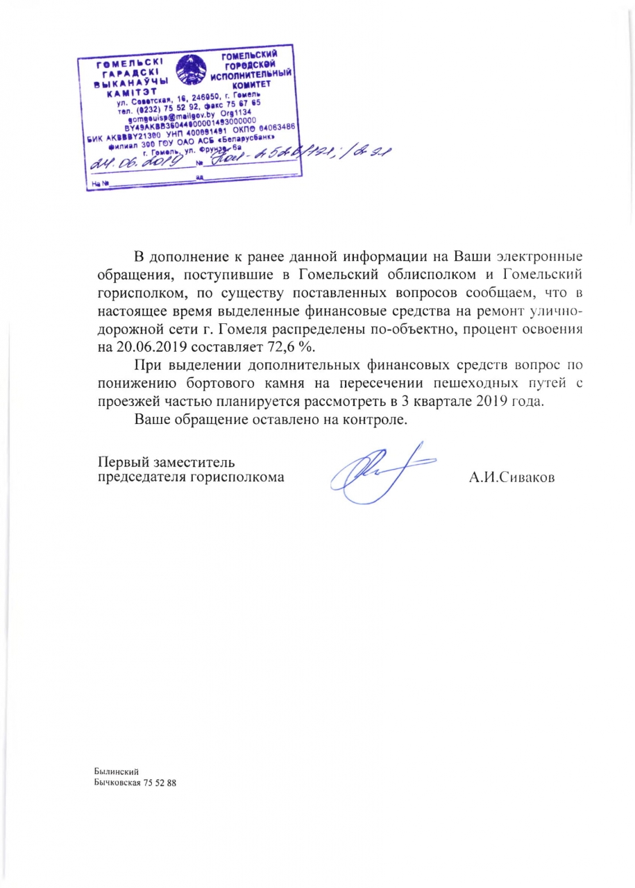 UPD Выделенные финансовые средства на ремонт улично-дорожной сети Гомеля распределены по-объектно, процент освоения на 20 июня составляет 72,6%. При выделении доп.финансирования вопрос по понижению бортового камня на пересечении пешеходных путей с проезжей частью планируется рассмотреть в III квартале 2019 г.