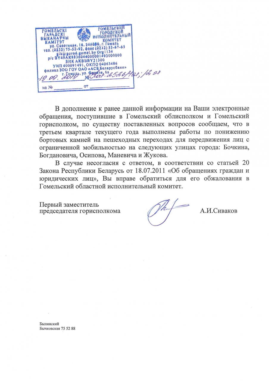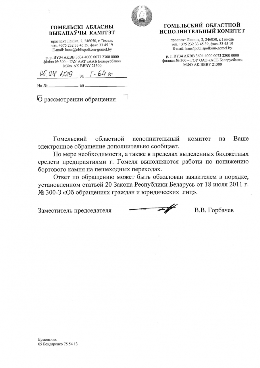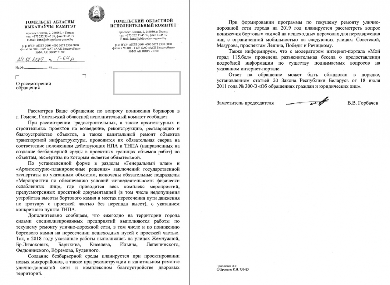 3) Просим в ответах на заявки в сервисе 115.бел, посвященные вопросам инфраструктуры для маломобильных граждан, сообщать когда проводились работы и когда объект введен в эксплуатацию, а также разъяснить порядок разработки и утверждения проекта, согласно которому на указанном в заявке участке понижение бортового камня не предусмотрено;