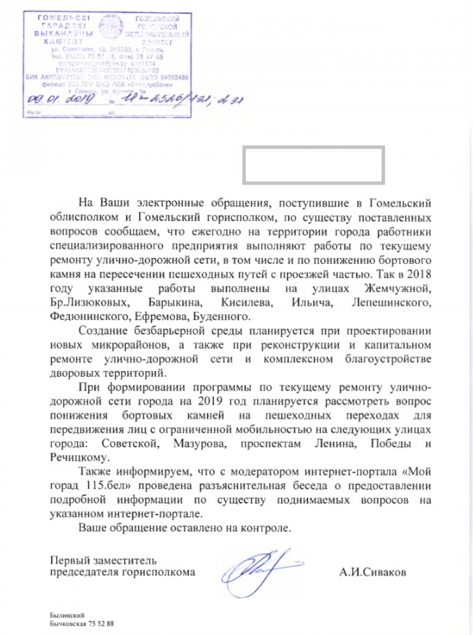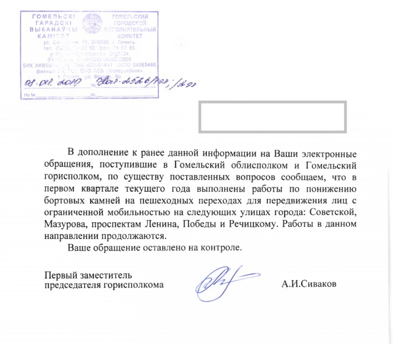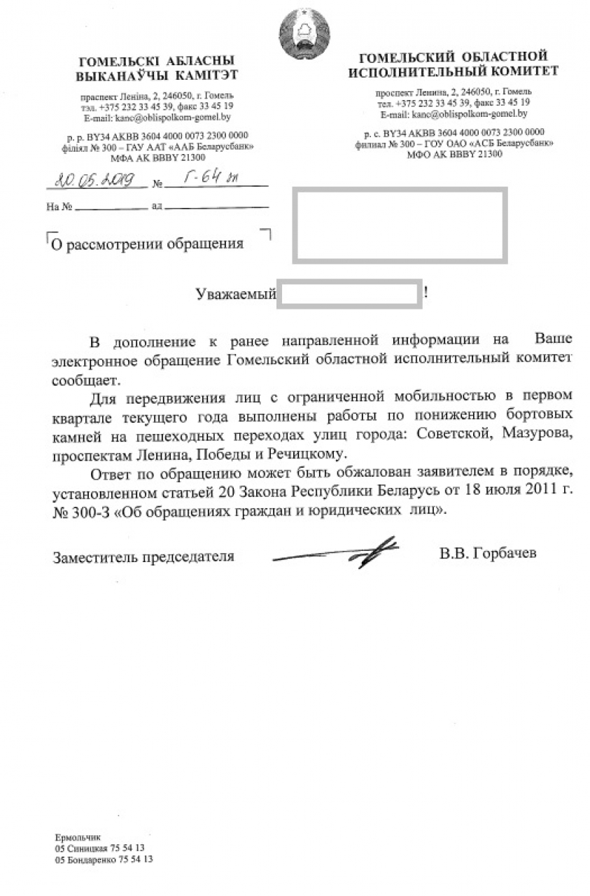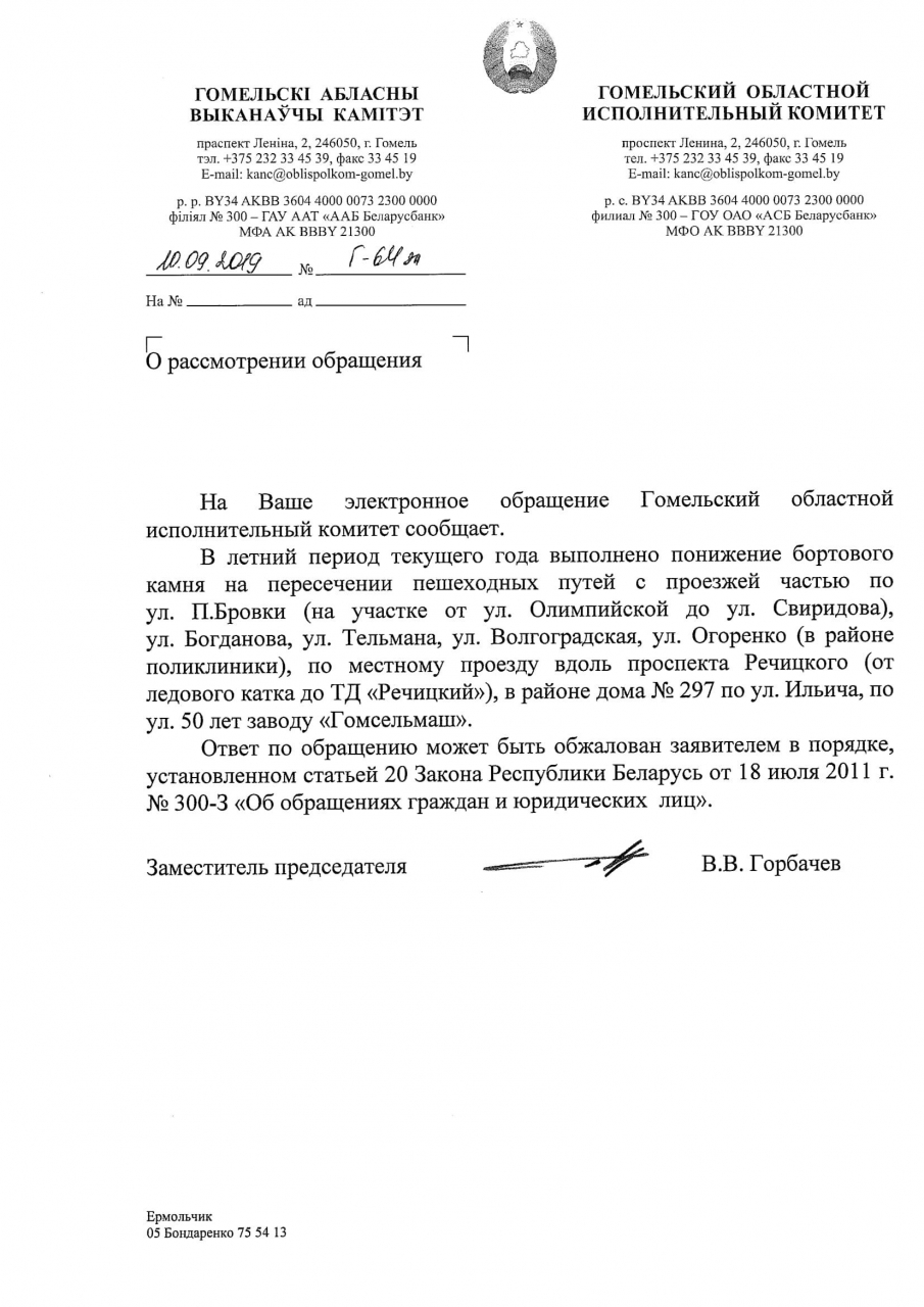 3) Просим в ответах на заявки в сервисе 115.бел, посвященные вопросам инфраструктуры для маломобильных граждан, сообщать когда проводились работы и когда объект введен в эксплуатацию, а также разъяснить порядок разработки и утверждения проекта, согласно которому на указанном в заявке участке понижение бортового камня не предусмотрено;