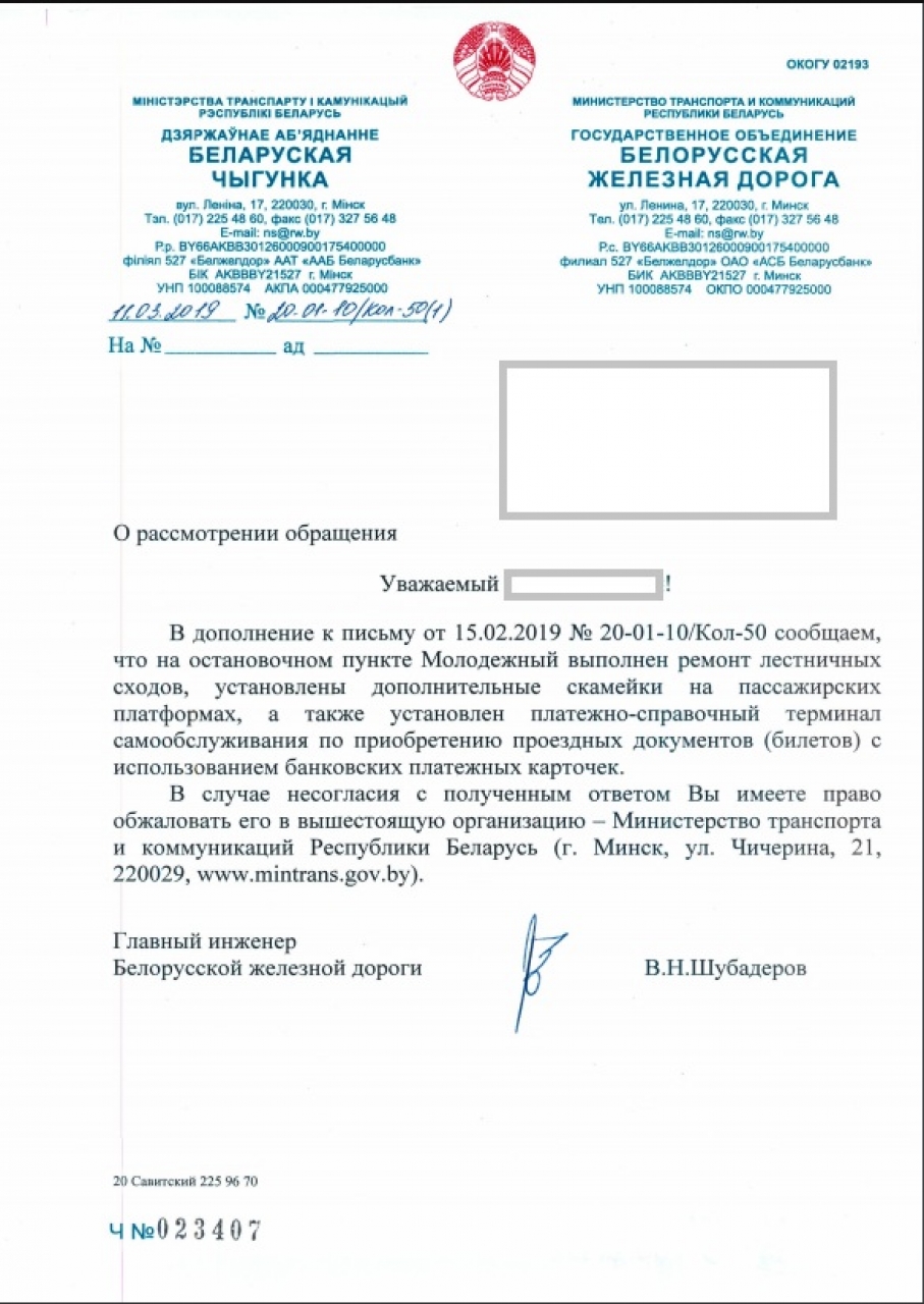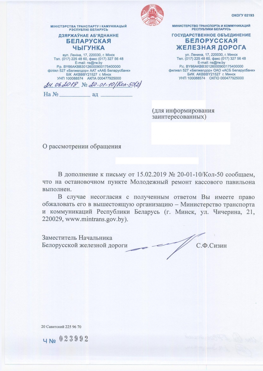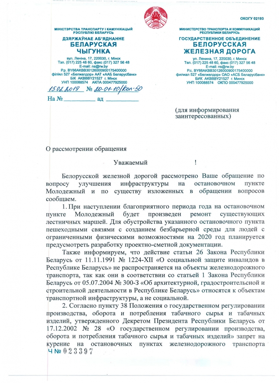 В связи с вышеизложенным и на основании Устава Белорусской железной дороги, утвержденного Постановлением Совета Министров Республики Беларусь от 10.01.2009 N 19, который определяет, что главными целями деятельности Белорусской железной дороги являются обеспечение потребностей государства, юридических и физических лиц в железнодорожных перевозках, работах и услугах, осуществляемых (оказываемых) Белорусской железной дорогой, мы хотим обратить Ваше внимание на необходимость решения насущных проблем и предложить некоторые улучшения: