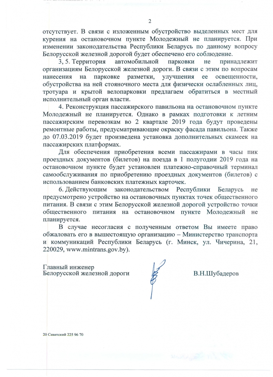 2. К сожалению, многие граждане не приобщились к общемировой тенденции борьбы с курением, и эта проблема особенно остро стоит в местах публичных, о.п. Молодежный не исключение. На станции отсутствуют специально отведенные места для граждан курящих, пассажиры, ожидающие электропоезд, очень сильно страдают от табачного дыма. Мы считаем, что устройство зон должно идти совместно с доступной информацией о запрете курения в иных местах со ссылками на санкционную часть статьи 17.9. КоАП.