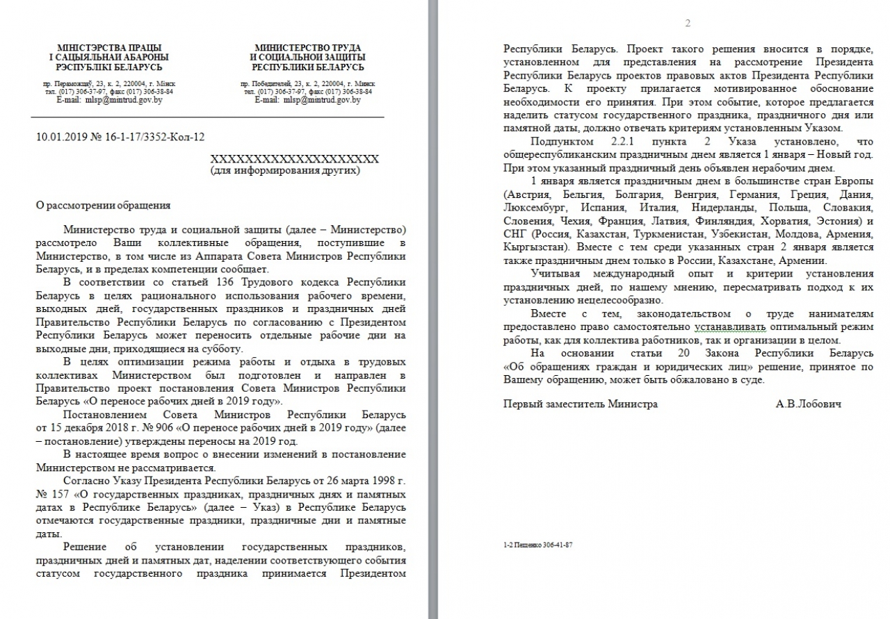 Просим положительно пересмотреть решение о переносе рабочего дня с 2 января 2019 года на любую другую субботу или утвердить 2 января 2019 г. как выходной день без переноса..