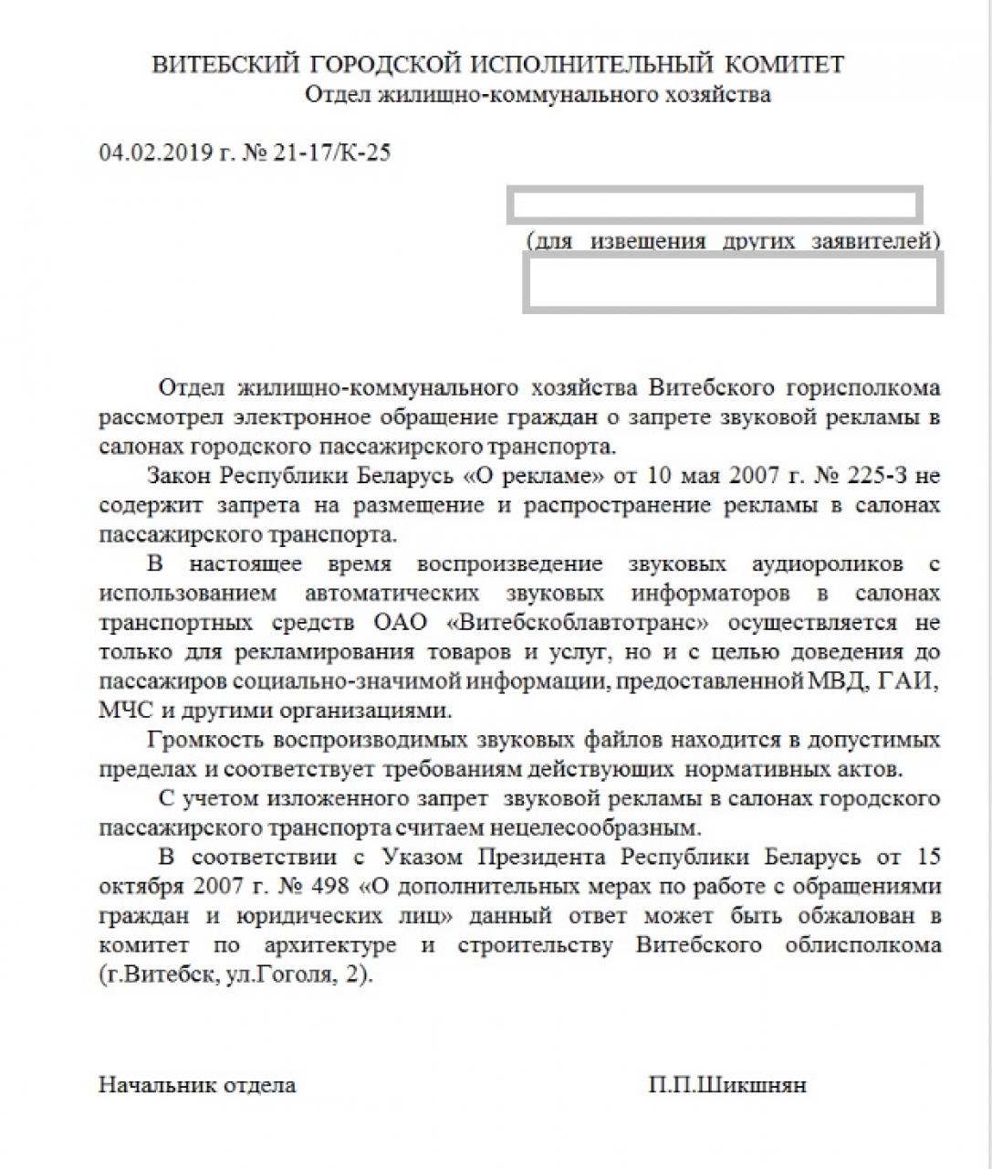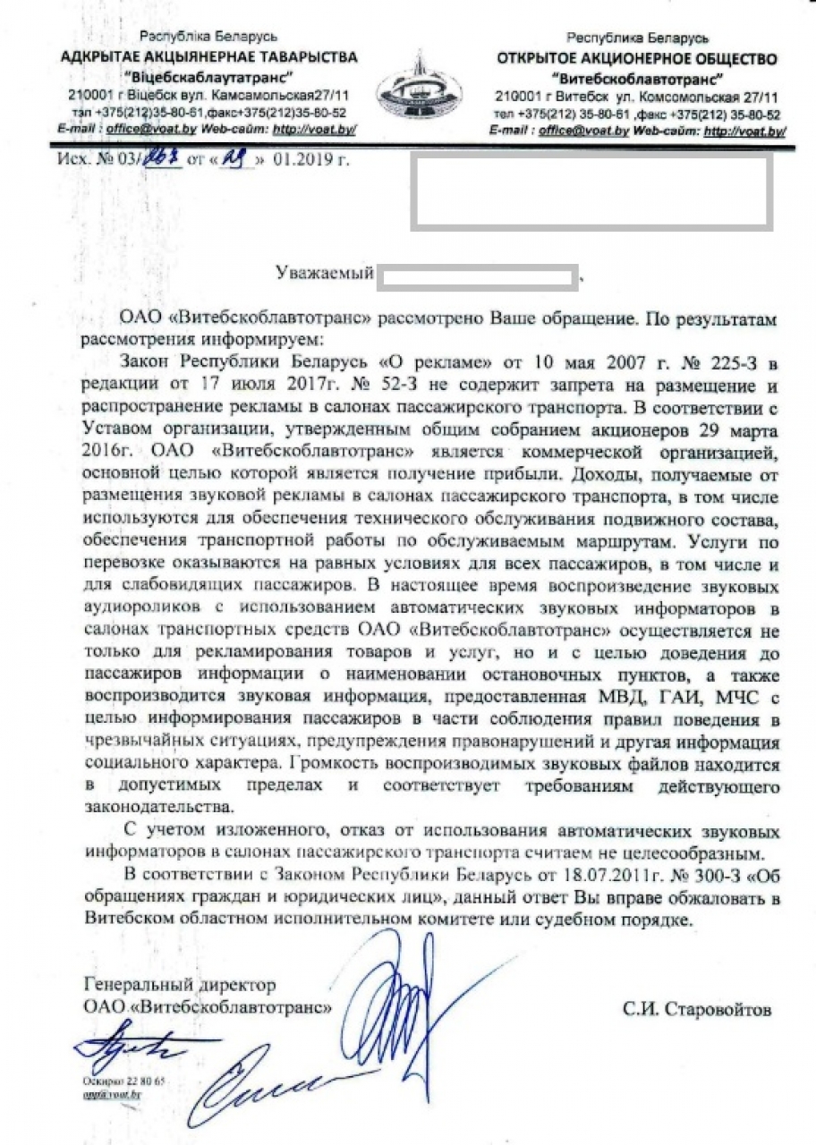На основании ст. 41 Закона «О местном управлении и самоуправлении», которая устанавливает, что исполкомы создают условия для предоставления транспортных услуг населению и организуют транспортное обслуживание граждан на соответствующей территории, просим запретить звуковую рекламу в салонах общественного транспорта в городе Витебске.