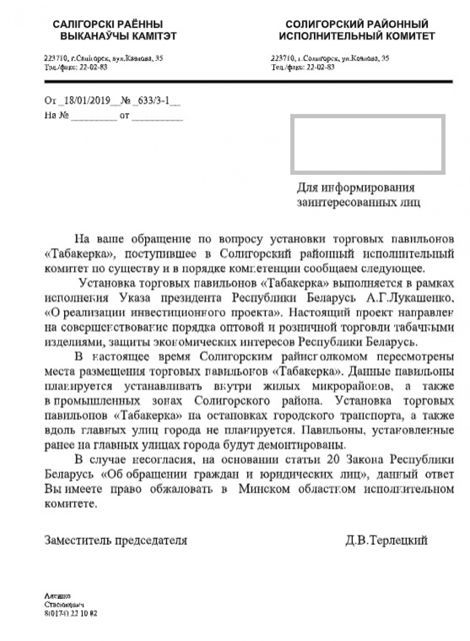 На основании ст. 41 Закона «О местном управлении и самоуправлении», которая устанавливает, что исполкомы создают условия для обеспечения граждан услугами связи, общественного питания, торговли и бытового обслуживания, учитывая, что исполкомами принимается решение о включении объектов торговли в Торговый реестр, просим запретить установку киосков по продаже табачных изделий на остановках общественного транспорта в Солигорске.