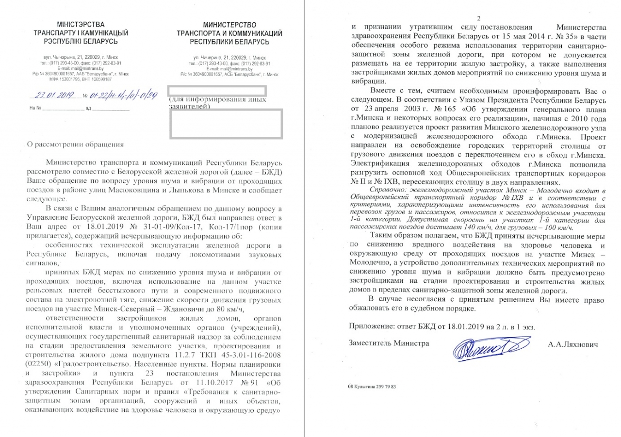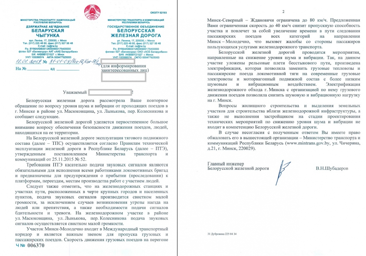 В обращении было конкретно указано место возникновения проблемы, это улицы Масюковщина, Лынькова, пер.Колесникова, Вы ссылаетесь на мою регистрацию, указывая, что расстояние до железной дороги там более 1 км., но место моей регистрации не имеет ничего общего с проблемным местом. Кроме того, как Вы указываете, участок железной дороги Минск-Молодечно был введен в эксплуатацию в 1965 году, с тех пор интенсивность движения ж.д. составов увеличилась в разы, скорость, частота и грузоподъемность также увеличились, что негативно сказалось в плане шумовых и вибрационных нагрузок на близлежащие жилые дома. За эти более чем полвека эксплуатации ж.д. также значительно увеличилось количество проживающих людей вблизи этого участка, город Минск вырос вплотную к посёлку Ждановичи, а это всё спальные районы, в которых люди хотят отдохнуть после трудового дня. Считаю, что оперировать нормами принятыми 54 года назад, тем более в отношении столицы нашего государства как минимум некорректно. Вышеуказанный участок железной дороги находится в городе Минске и должен выполняя свои функции не мешать людям живущим в близлежащих домах. Исходя из всего вышесказанного требую повторно рассмотреть моё заявление на тему снижения шумовой и вибрационной нагрузки на жилой сектор прилегающий к железной дороге. В ближайшей перспективе предлагается ограничить скорость до 40 км/ч на этом участке (от МКАД до центра города), а также запретить машинистам подавать звуковые сигналы в городе (ж.д. полностью огорожена, что исключает нахождение кого-либо на путях, поэтому сигналить тут некому). Эти мероприятия полностью бесплатны, а позволят хотя-бы приблизиться к зоне комфорта проживающим тут жильцам.