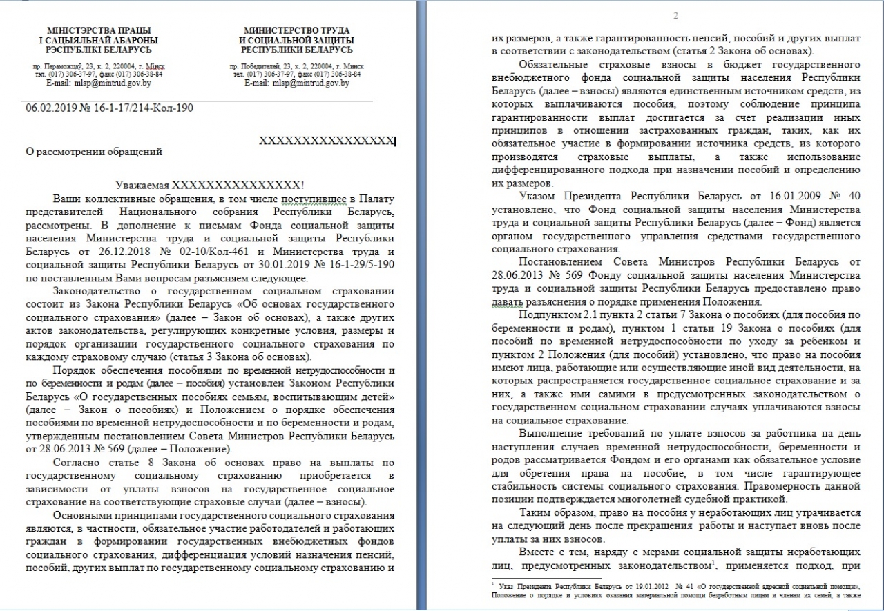Мы обращаемся к Палате представителей Национального собрания Республики Беларусь и Министерству труда и соцзащиты – считаете ли вы ЗАКОННЫМ установление «периода сгорания» права на пособие по воле двух (пусть и высокопоставленных) чиновников ФСЗН или все же при определении ПРАВА на получение пособия ДОЛЖНА УЧИТЫВАТЬСЯ уплата взносов "за ВСЮ жизнь»?