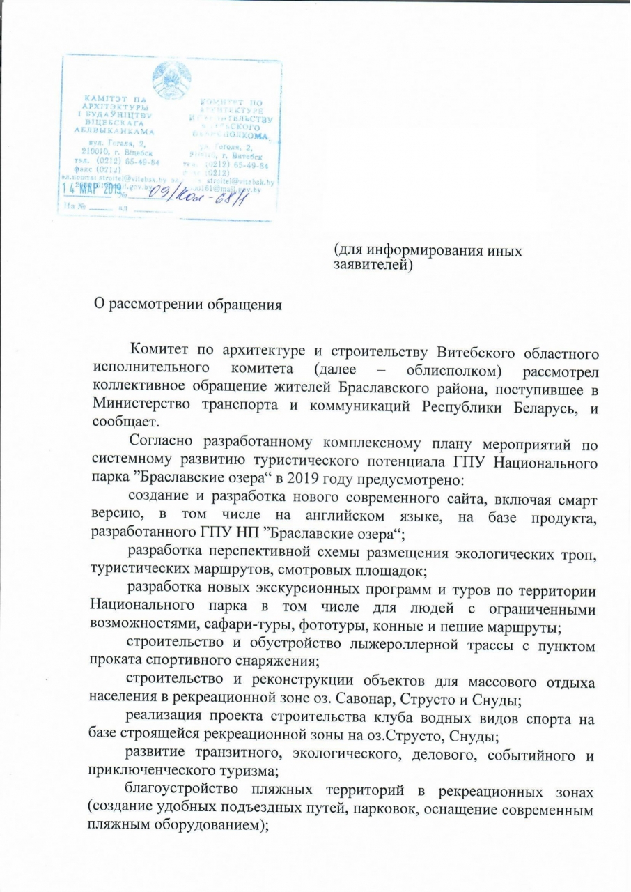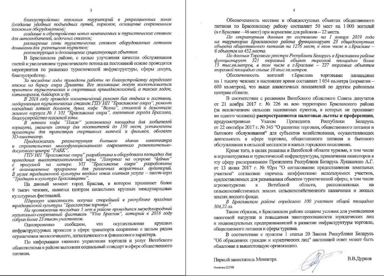 Мы, нижеподписавшиеся, на основании Положения о Министерстве спорта и туризма Республики Беларусь, утвержденного Постановлением Совета Министров Республики Беларусь от 29.07.2006 N 963, которое устанавливает, что Минспорта обеспечивает всестороннюю государственную поддержку развития туризма, просим устроить публичный конкурс на создание плана по развитию туристического потенциала Национального Парка Браславские Озера, а также организовать комиссию, которая выберет лучший проект, который будет соблюдать интересы Республики Беларусь, позволит привлечь намного больше туристов из ЕС, Беларуси и РФ, сохранив при этом экологическую ситуацию в Национальном Парке.