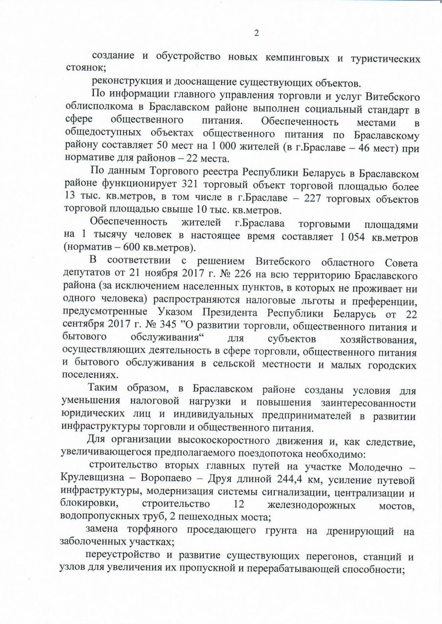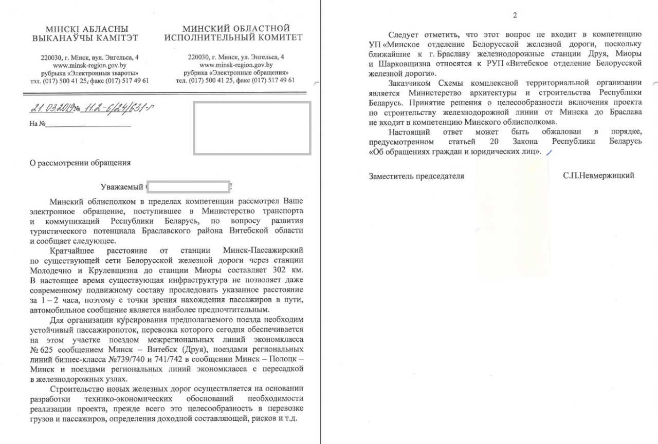Туризм в регионе будет развиваться быстрее, если в Браслав из Минска можно будет добраться за 1-2 часа на скоростном поезде. Сейчас автобусы из Минска едут в Браслав более 4 часов. В связи с большой отдалённостью от крупных городов Республики, и от Минска в частности, мы также предлагаем построить железнодорожный путь в Браслав (ближайшая станция в Миорах, 42 км от Браслава), чтобы добраться в Браслав можно было и на скоростном современном поезде из Минска. На основании Положения о Министерство транспорта и коммуникаций, утвержденного Постановлением Совета Министров Республики Беларусь от 31.07.2006 N 985, которым к основным задачам Минтранспорта отнесена реализация единой дорожно-транспортной политики, направленной на создание условий для удовлетворения потребностей экономики и населения в транспортных услугах, просим рассмотреть такое предложение.