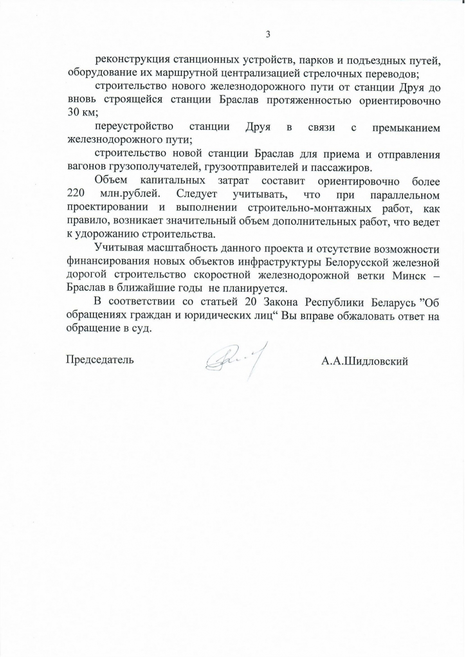 Строительсто скоростной железнодорожной ветки Минск-Браслав в ближайшие годы не планируется.