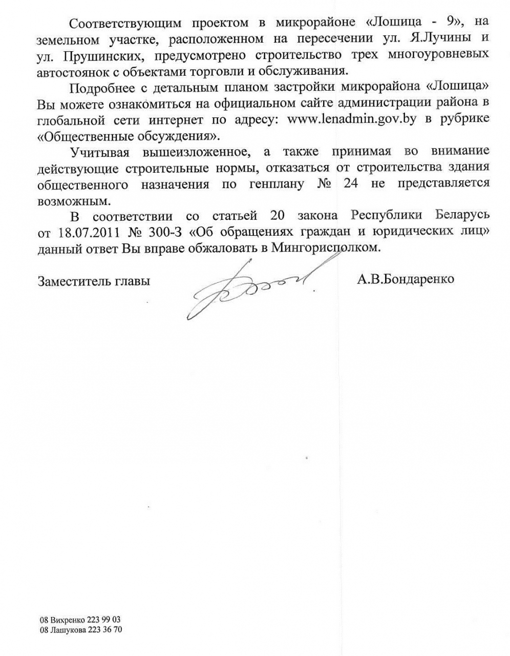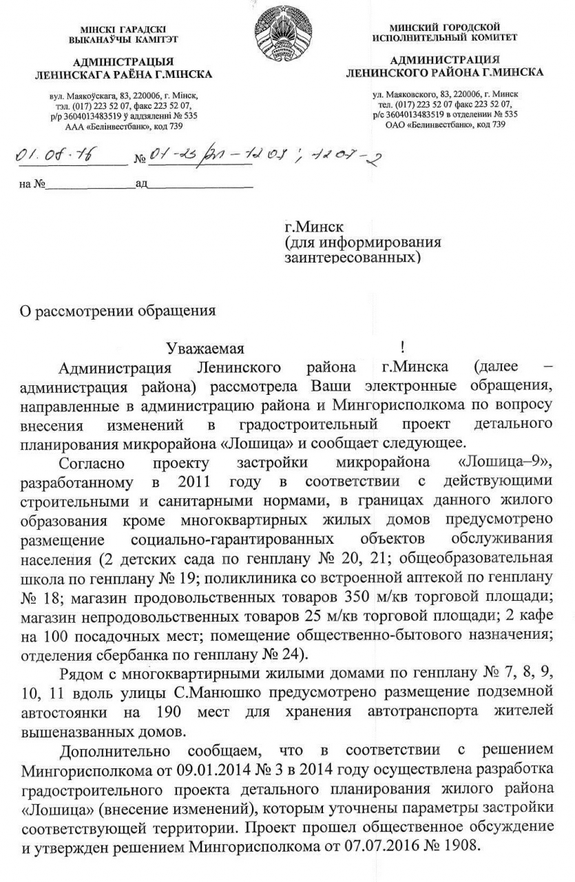 Мы, жильцы микрорайона Лошица-9, обращаемся с просьбой пересмотреть генеральный план нашего микрорайона, поскольку он не отвечает нуждам жителей. Главная проблема - недостаточное количество парковочных мест, усугубленная тем, что между домами №№4, 6, 7 и 8 по генплану запроектирован магазин. Обращаем внимание на то, что в радиусе 200 метров от этого места (по адресу Янки Лучины, 64) находится помещение, предусмотренное под магазин, но не функционирующее длительное время, очевидно, по причине нерентабельности, поскольку в районе есть 3 гипермаркета и несколько магазинов шаговой доступности, отвечающих нуждам населения. Помимо этого в сдающихся в этом году домах на придомовой территории запланировано от 10 до 26 машиномест на каждый из 5 домов серии М11190 (по 132 квартиры). Данное количество не отвечает номативам ТКП, которые с 1 декабря 2015 года обязуют застройщиков обеспечивать вводимые в эксплуатацию дома из расчета 1,25 машиноместа на каждую квартиру.