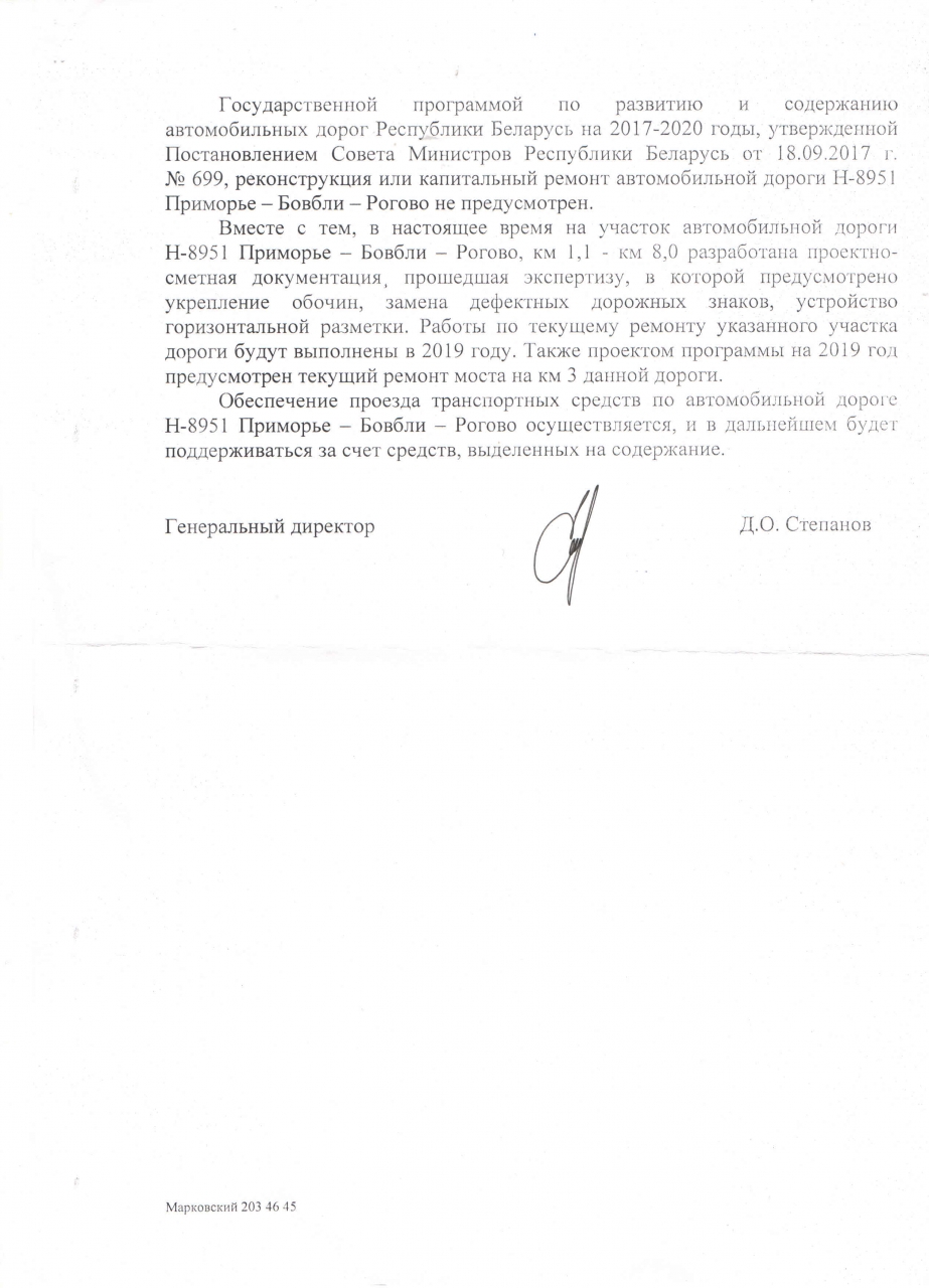 На участок автомобильной дороги Н8951 Приморье-Бовбли-Рогово, км 1,1 - км 8 разработана проектно-сметная документация, которая предусматривает укрепление обочин, замену дефектных дорожных знаков, устройство горизонтальной разметки. Работы по текущему ремонту указанного участка будут выполнены в 2019 г., также предусмотрен ремонт моста на км 3 данной дороги.
