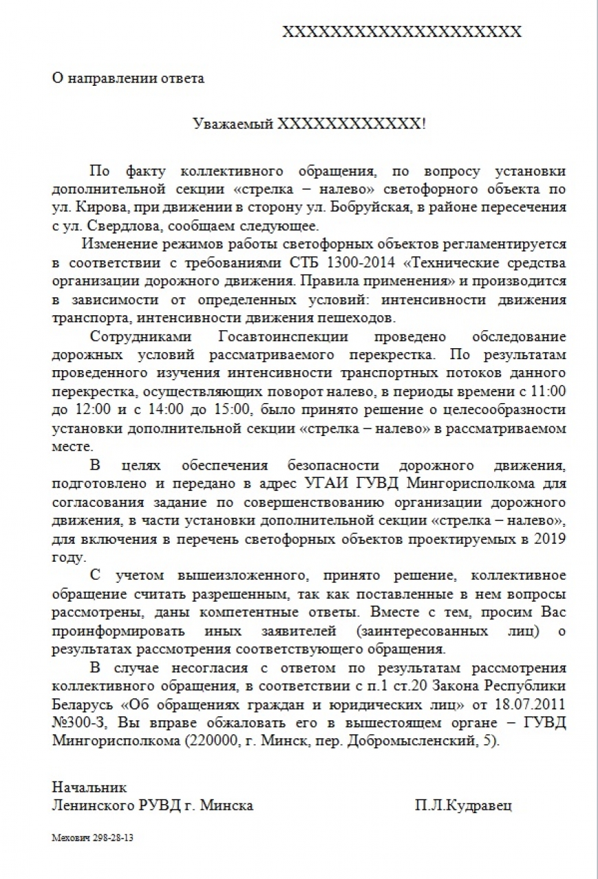 На основании ст. 43 Закона «О местном управлении и самоуправлении», которая устанавливает, что исполкомы базового уровня обеспечивают безопасность дорожного движения, просим рассмотреть возможность установки стрелки левого поворота (на Свердлова) для светофора по улице Кирова со стороны в направлении к вокзалу.