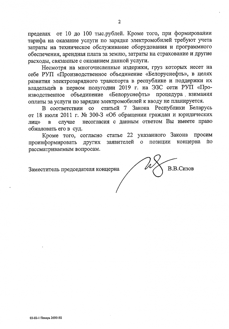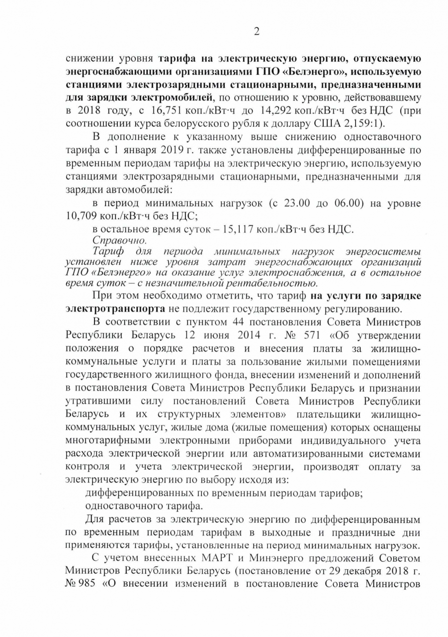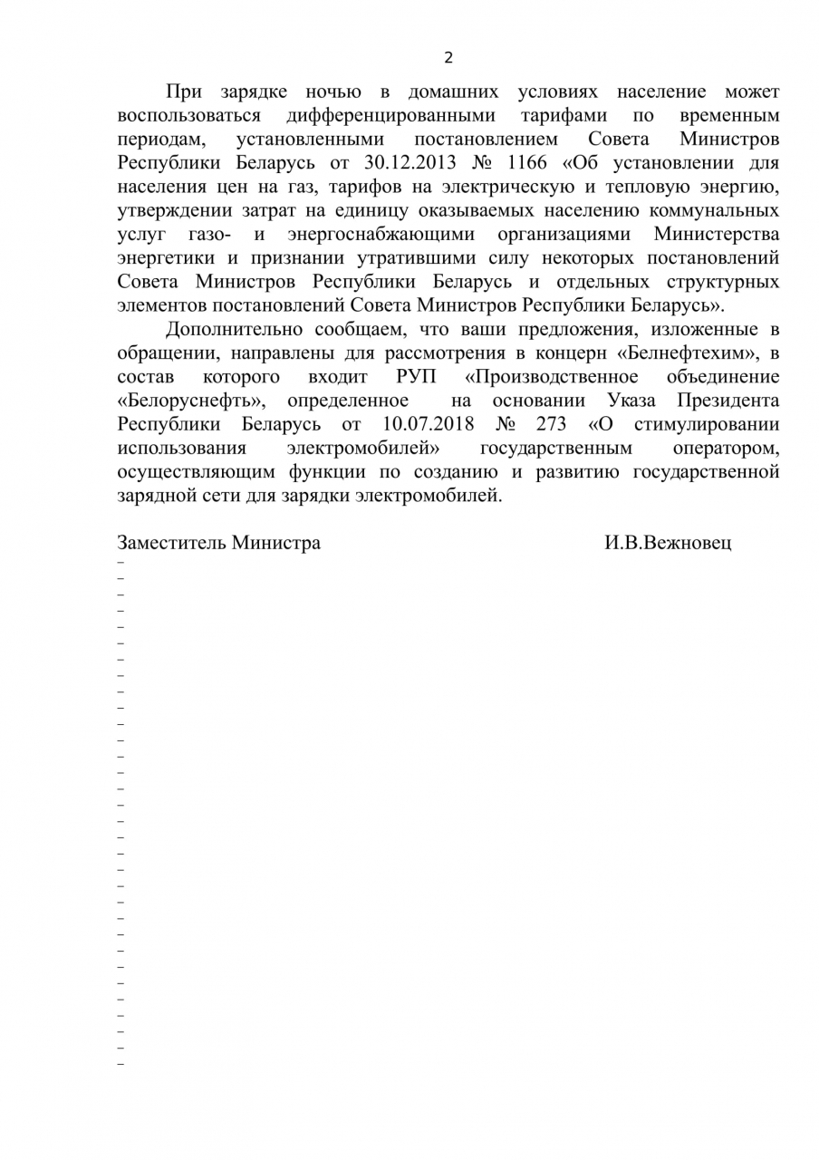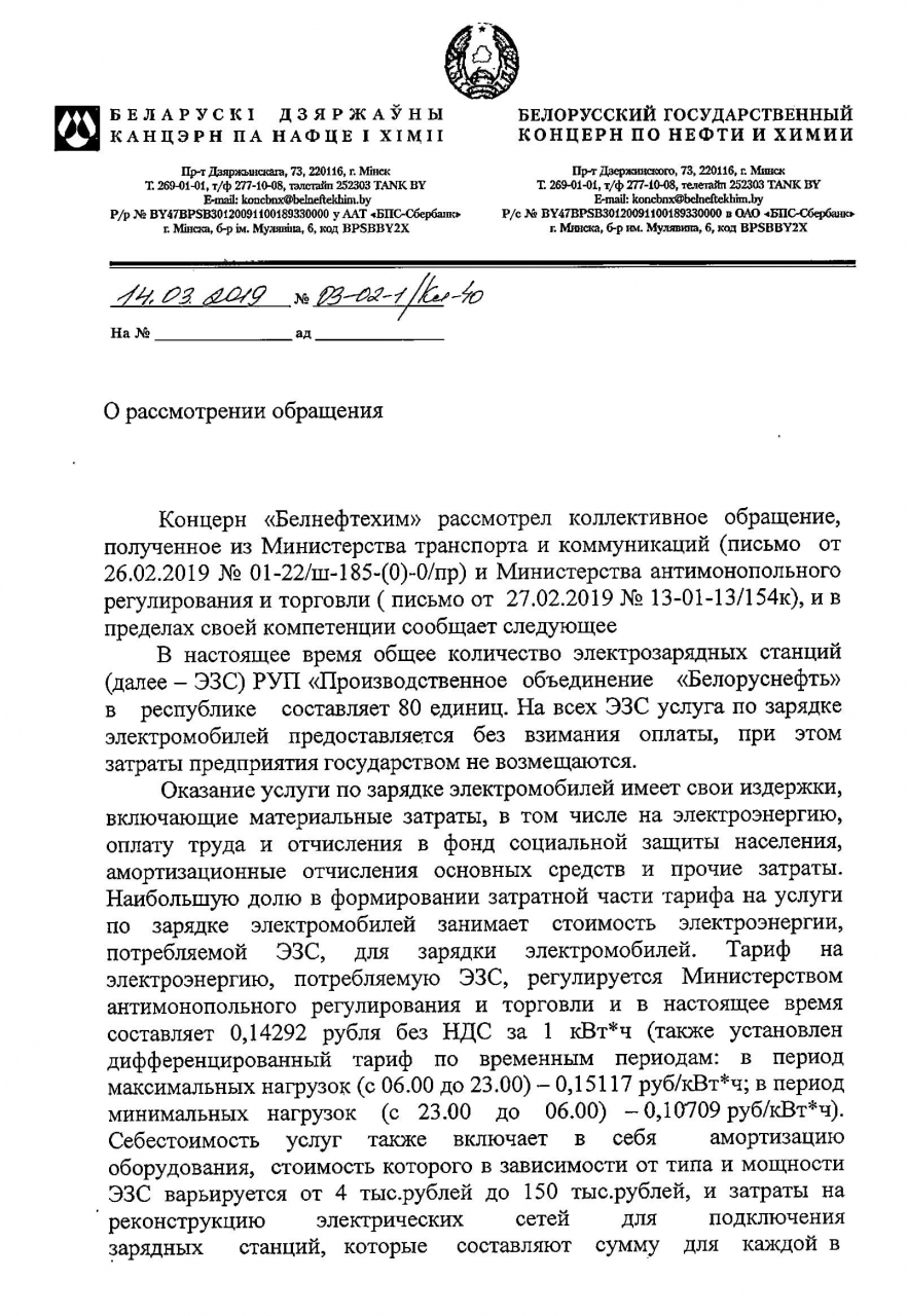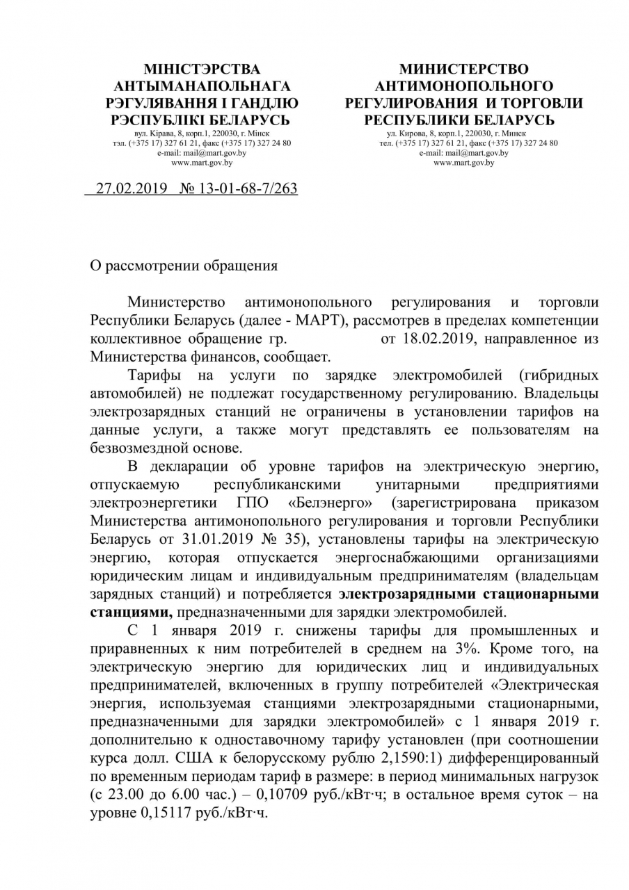 Тарифы на услуги по зарядке электромобилей (гибридных автомобилей) не подлежат государственному регулированию. Владельцы электрозарядных станций не ограничены в установлении тарифов на данные услуги, а также могут представлять ее пользователям на безвозмездной основе. Тем не менее предложения, изложенные в обращении, направлены для рассмотрения в концерн «Белнефтехим», в состав которого входит РУП «Производственное объединение «Белоруснефть», определенное на основании Указа Президента Республики Беларусь от 10.07.2018 № 273 «О стимулировании использования электромобилей» государственным оператором, осуществляющим функции по созданию и развитию государственной зарядной сети для зарядки электромобилей
