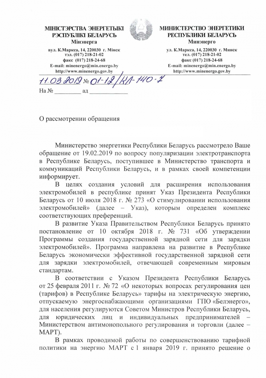 В связи со скорым вводом в эксплуатацию БелАЭС и предложениями президента Республики Беларусь А.Г. Лукашенко о популяризации электротранспорта в нашей стране, на основании Положения о Министерство транспорта и коммуникаций, утвержденного Постановлением Совета Министров Республики Беларусь от 31.07.2006 N 985, которым к основным задачам Минтранспорта отнесена реализация единой дорожно-транспортной политики, направленной на создание условий для удовлетворения потребностей экономики и населения в транспортных услугах, с учетом минимизации вредного воздействия на окружающую среду, предлагаем рассмотреть и внедрить конкретные шаги, которые будут стимулировать спрос на "чистые" автомобили.