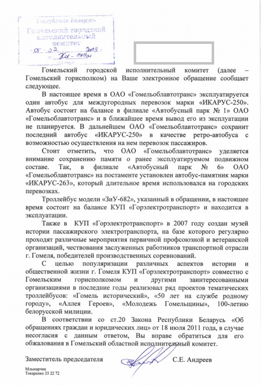 Считаем необходимым увековечить данную модель троллейбуса, ставшей поистине частью облика города Гомеля, сохранив и восстановив троллейбус ЗиУ-682 № 2652.