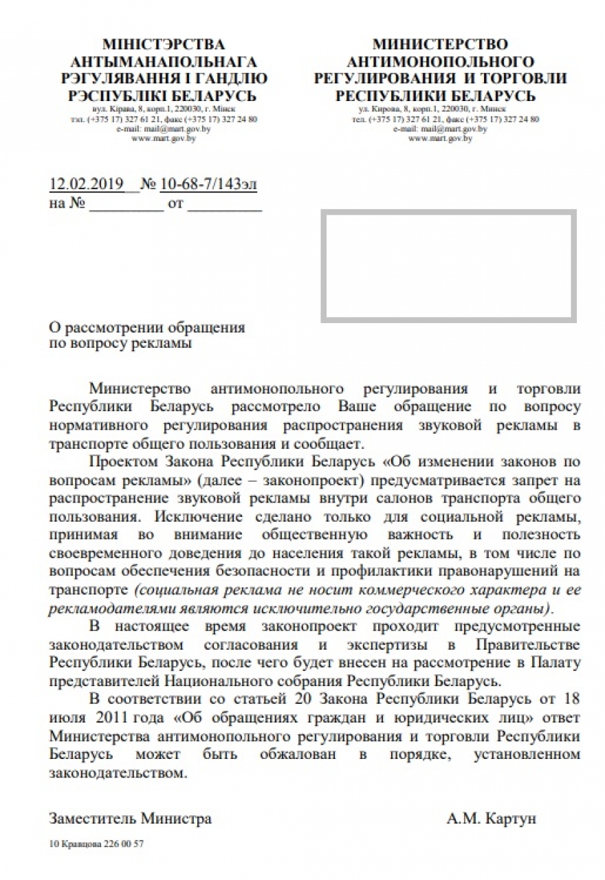 В соответствии с законом Республики Беларусь «О рекламе» в транспорте допускается распространение рекламы, сопровождаемые звуковым оформлением. Однако очень хочется донести до Министерства транспорта, что звук рекламы в общественном транспорте причиняет крайний дискомфорт пассажирам, так как люди лишены права отключать звук рекламы. Получается, что пассажир, оплачивая проезд, обязан соблюдать правила поведения в транспорте, но его права никто не учитывает. Звук рекламы в транспорте крайне навязчивый, громкий, мешает спокойному передвижению, а ведь человек проводит в дороге достаточно много времени, часто это путь на работу. И многим людям очень важно провести это время в комфорте, без навязчивого шума извне. Поэтому звук рекламных сообщений должен либо регулироваться пассажирами (что невозможно вообще) либо быть отключенным. Рекламы в жизни человека и так достаточно много, в транспорте она совершенно ни к чему. Во всяком случае, без звука реклама так же действенна, и кому надо, тот с удовольствием прочтет объявление по телевизору, пока добирается до места назначения.
