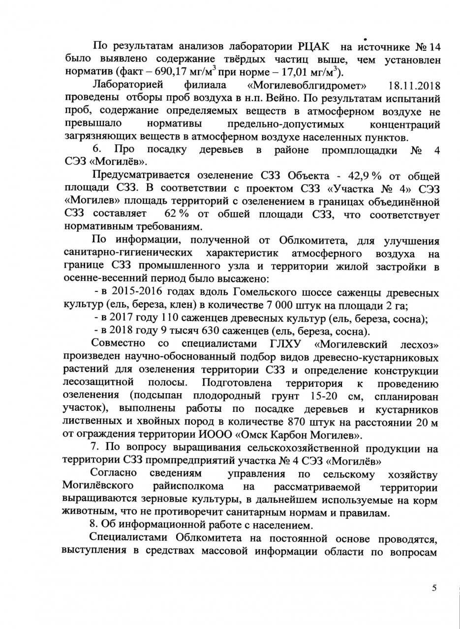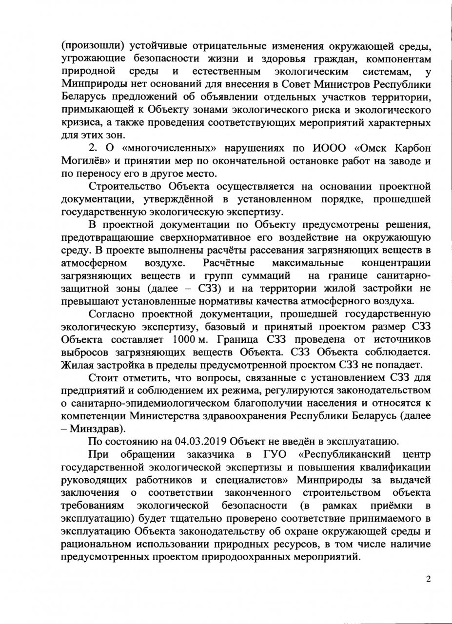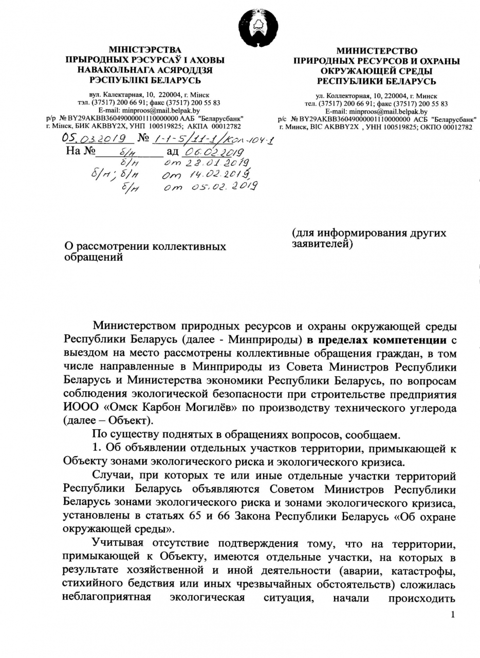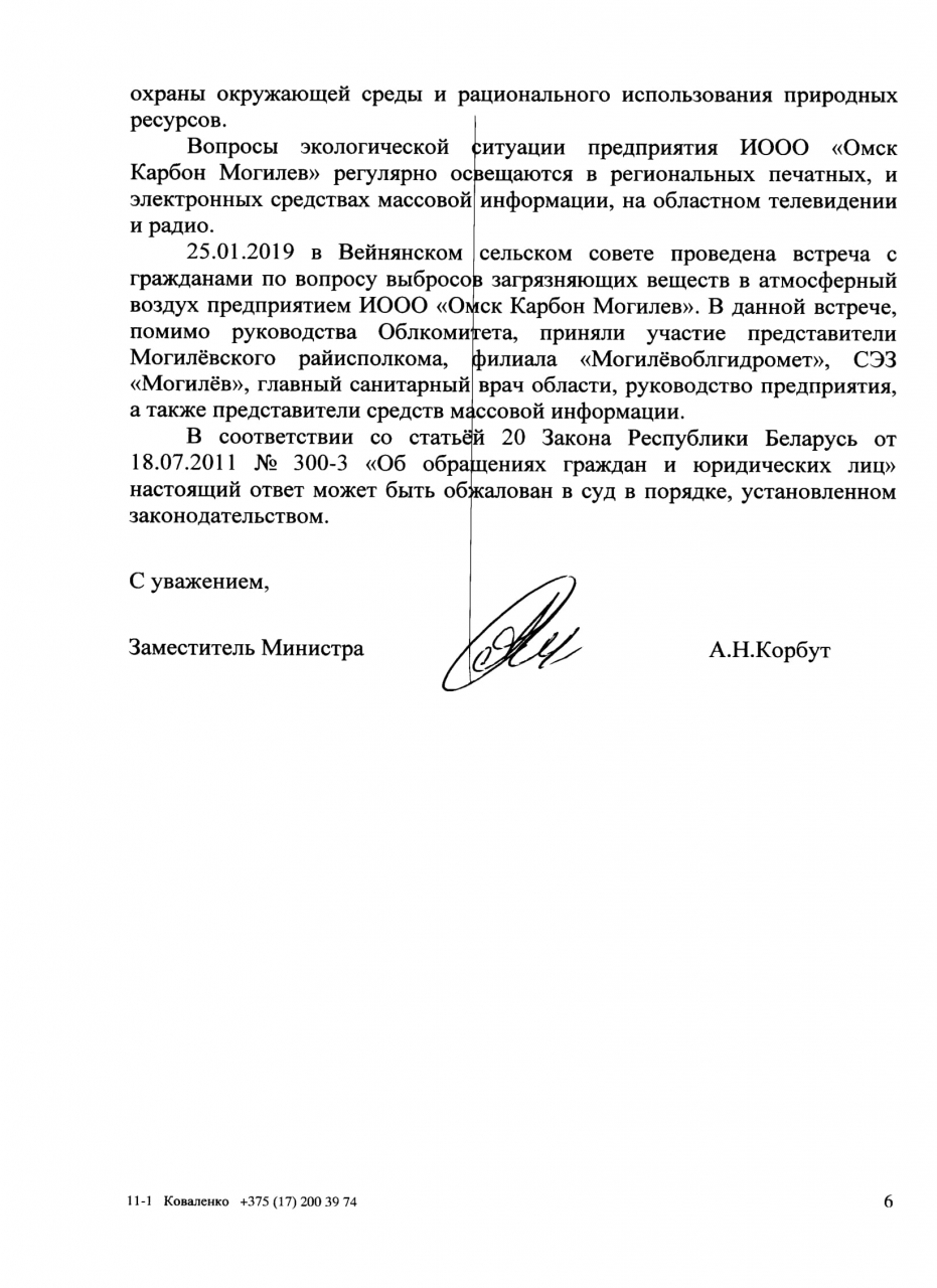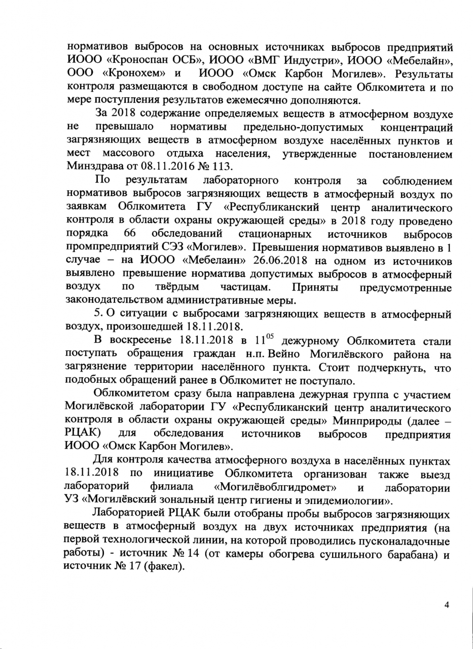 Только 18 ноября 2018 года Могилёвским областным комитетом природных ресурсов о охраны окружающей среды, после многочисленных обращений граждан, была направлена группа специалистов для обследования источников выбросов ИООО «Омск Карбон Могилёв», которая установила превышение уровня загрязнений (факт–690,17 мг/м3, норматив - 17,01мг/м3). Руководствуясь ст. 11 и 17 Закона Республики Беларусь «О Совете Министров Республики Беларусь» и ст.46 Конституции Республики Беларусь, Положением о Министерстве природных ресурсов и охраны окружающей среды Республики Беларусь, утвержденным Постановлением Совета Министров Республики Беларусь от 20.06.2013 № 503, которым установлено, что Минприроды осуществляет контроль в области охраны окружающей среды, организует работы по проведению инвентаризации выбросов загрязняющих веществ и парниковых газов в атмосферный воздух, просим: