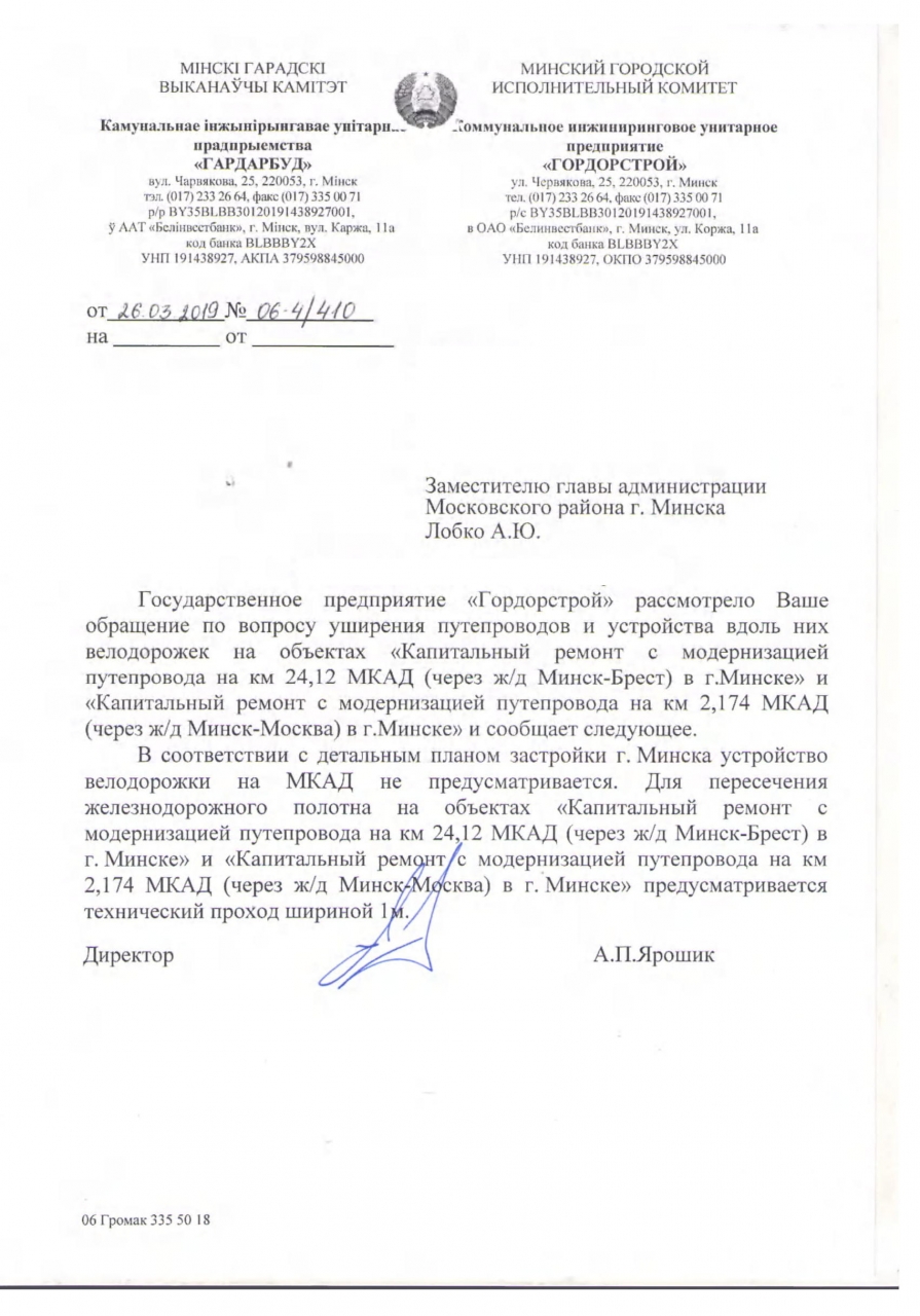Согласно детальному плану застройки г.Минска устройство велодорожки на МКАД не предусмотрено, зато для пересечения железнодорожного полотна на объектах строительства предусмотрен технический проход шириной 1 м.