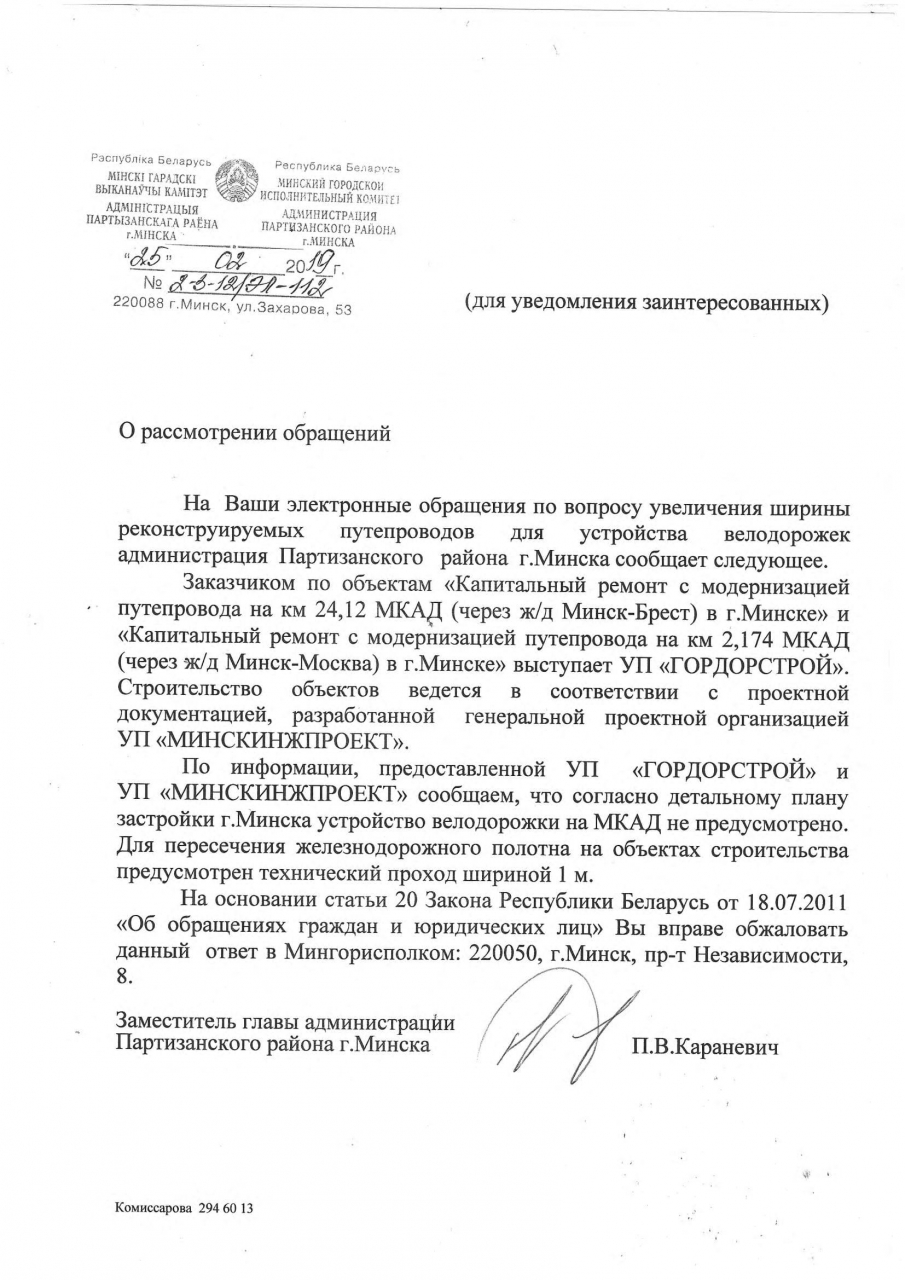 Поскольку сейчас идёт капитальный ремонт путепроводов в районе улиц Н.Орды и Липковской, на основании ст. 41 Закона «О местном управлении и самоуправлении», которая устанавливает, что исполкомы организуют строительство, реконструкцию, ремонт и содержание местных автомобильных дорог, управляют дорожной деятельностью, предлагаем на этом месте сделать новые путепроводы более широкими, с учётом размещения вдоль них велодорожек, поскольку объехать данные участки дороги на велосипеде невозможно, а ехать в полуметре от машин очень рискованно.