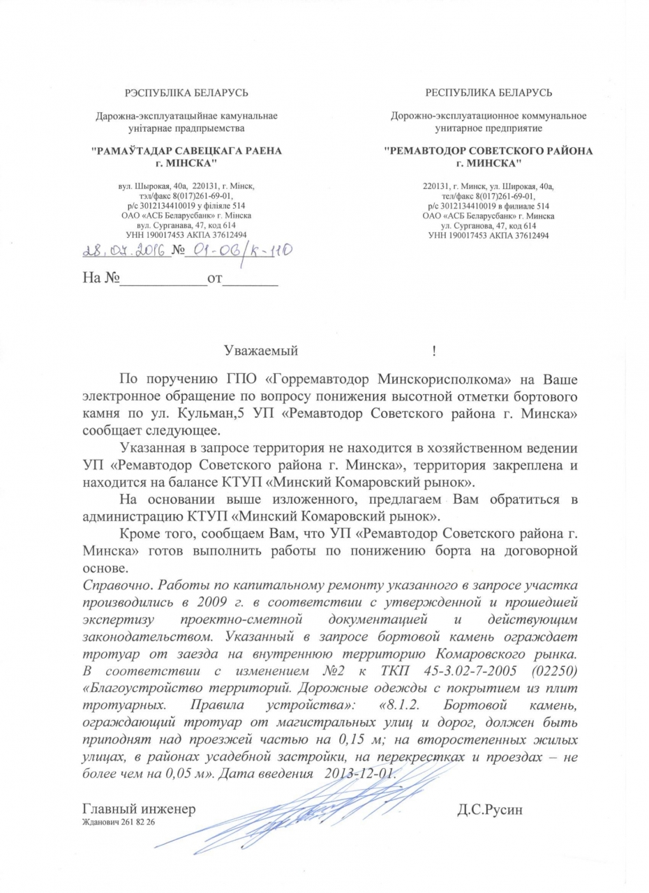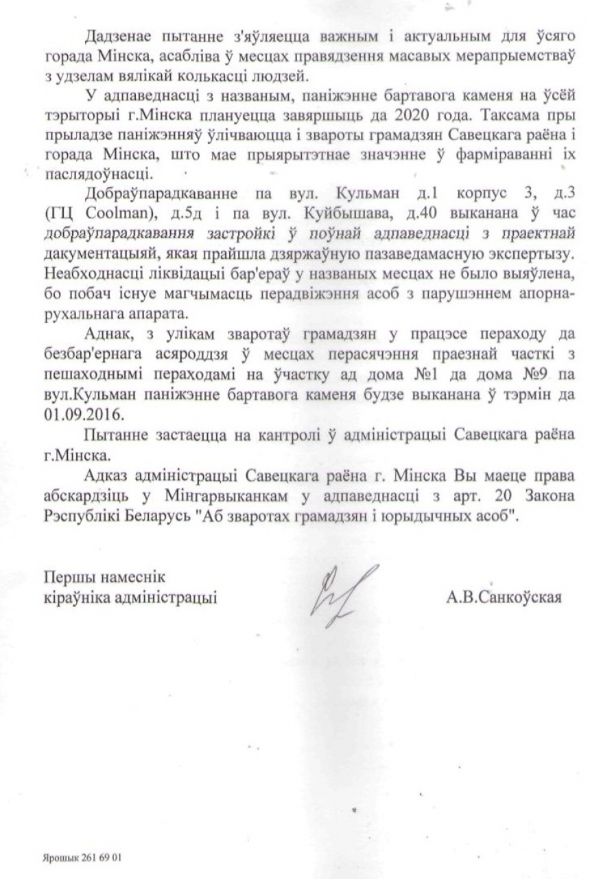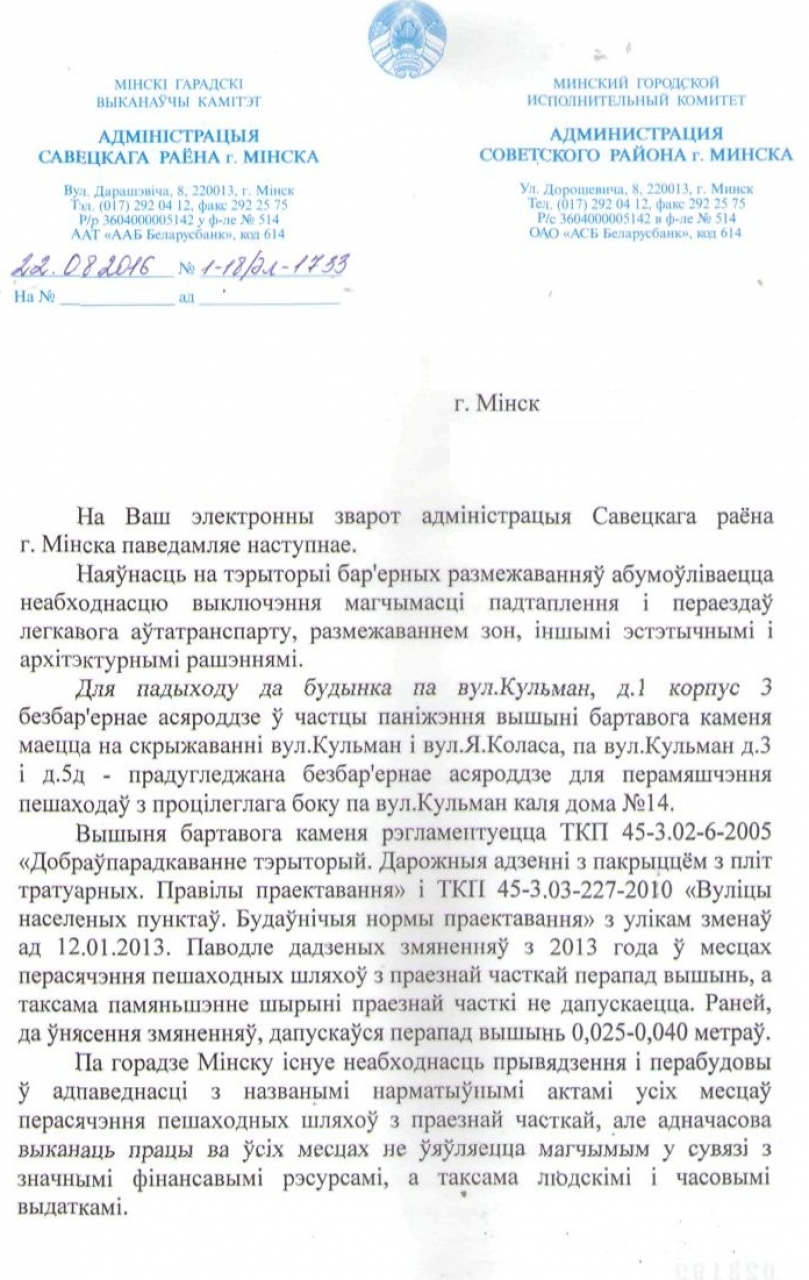 Адначасова звяртаем увагу Рамаўтадара Савецкага раёна на неабʼходнасць прывядзення да стандартаў безбарʼернага асяроддзя неадпаведных нормам бардзюраў на: