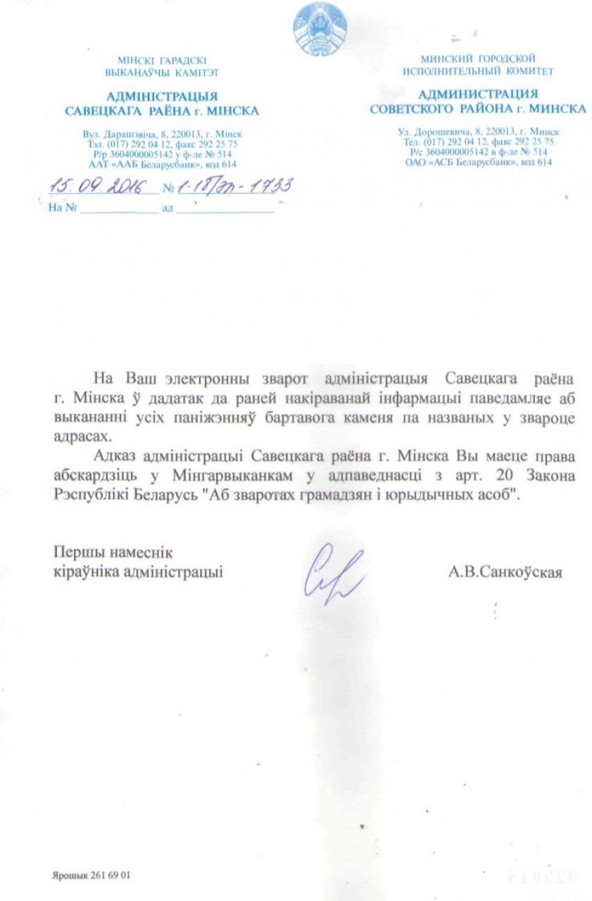 На дадзены зварот праз сайт 115.бел быў атрыманы наступны адказ: