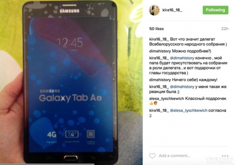 По информации, распространенной в СМИ (http://news.tut.by/society/501562.html) каждый из участников собрания получил планшет Samsung Galaxy Tab A 7.0 (2016).