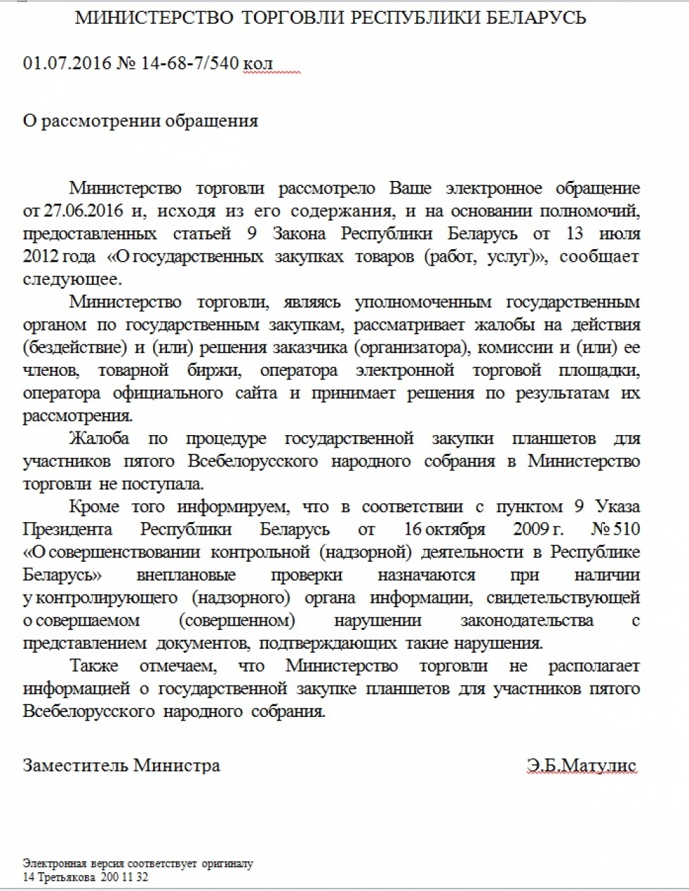 2. Министерство торговли Республики Беларусь. Сообщить, были ли соблюдены все нормы и правила действующего законодательства при проведении закупки планшетов для делегатов Всебелорусского собрания