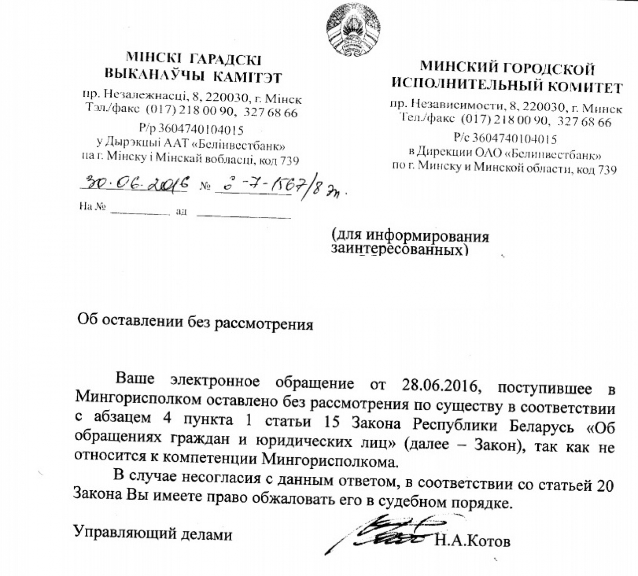 1. Администрацию Президента Республики Беларусь и Минский городской исполнительный комитет: