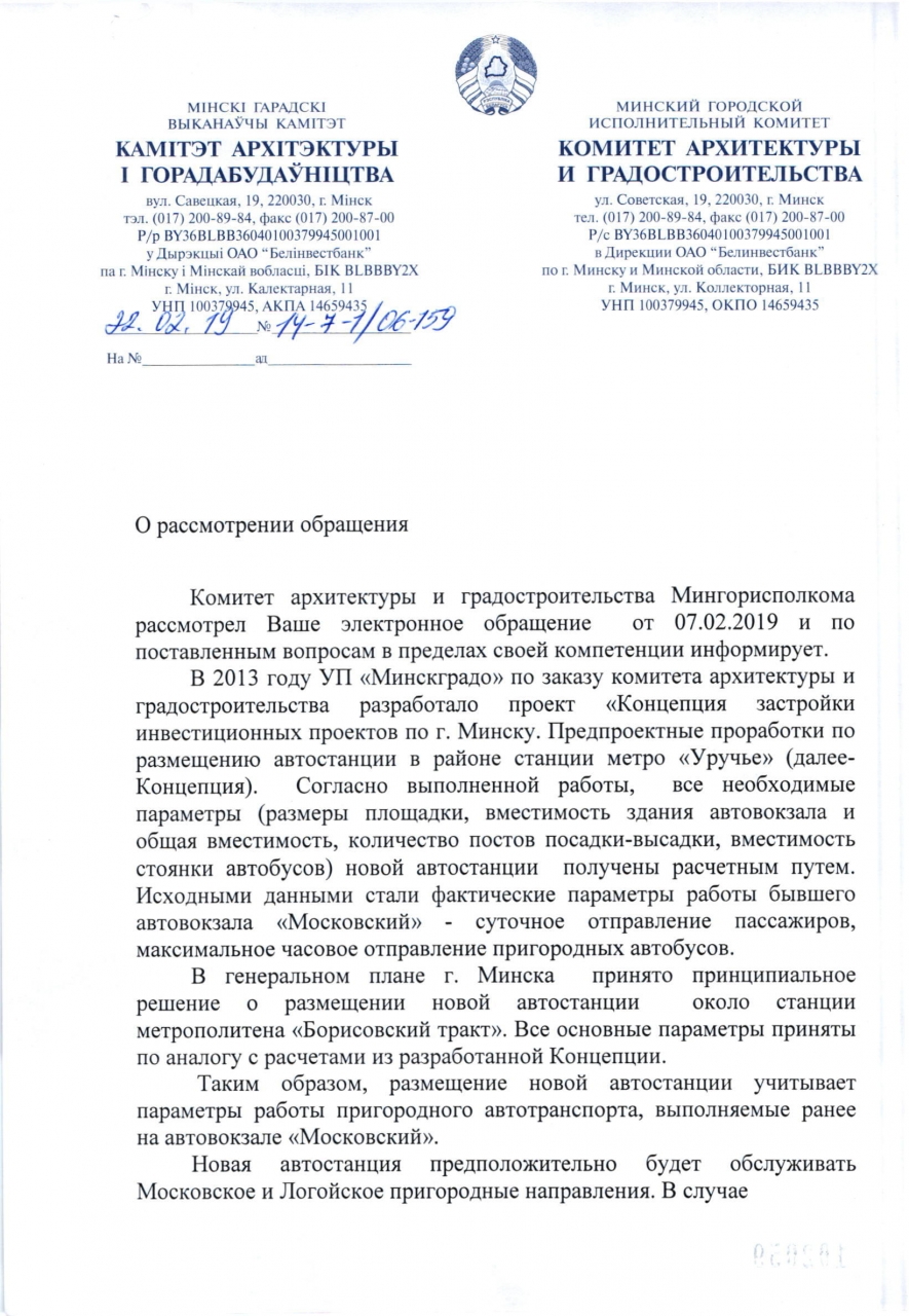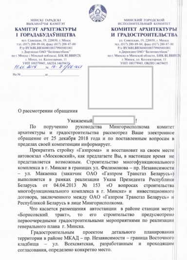 11 января 2019 получен ответ на электронное обращение по поводу восстановления автовокзала "Московский" (копия прилагается). Комитет архитектуры и градостроительства заявил, что строительство новой автостанции около станции метро "Борисовский тракт" предусмотрено первоочередными градостроительными мероприятиями по реализации генерального плана г. Минска.