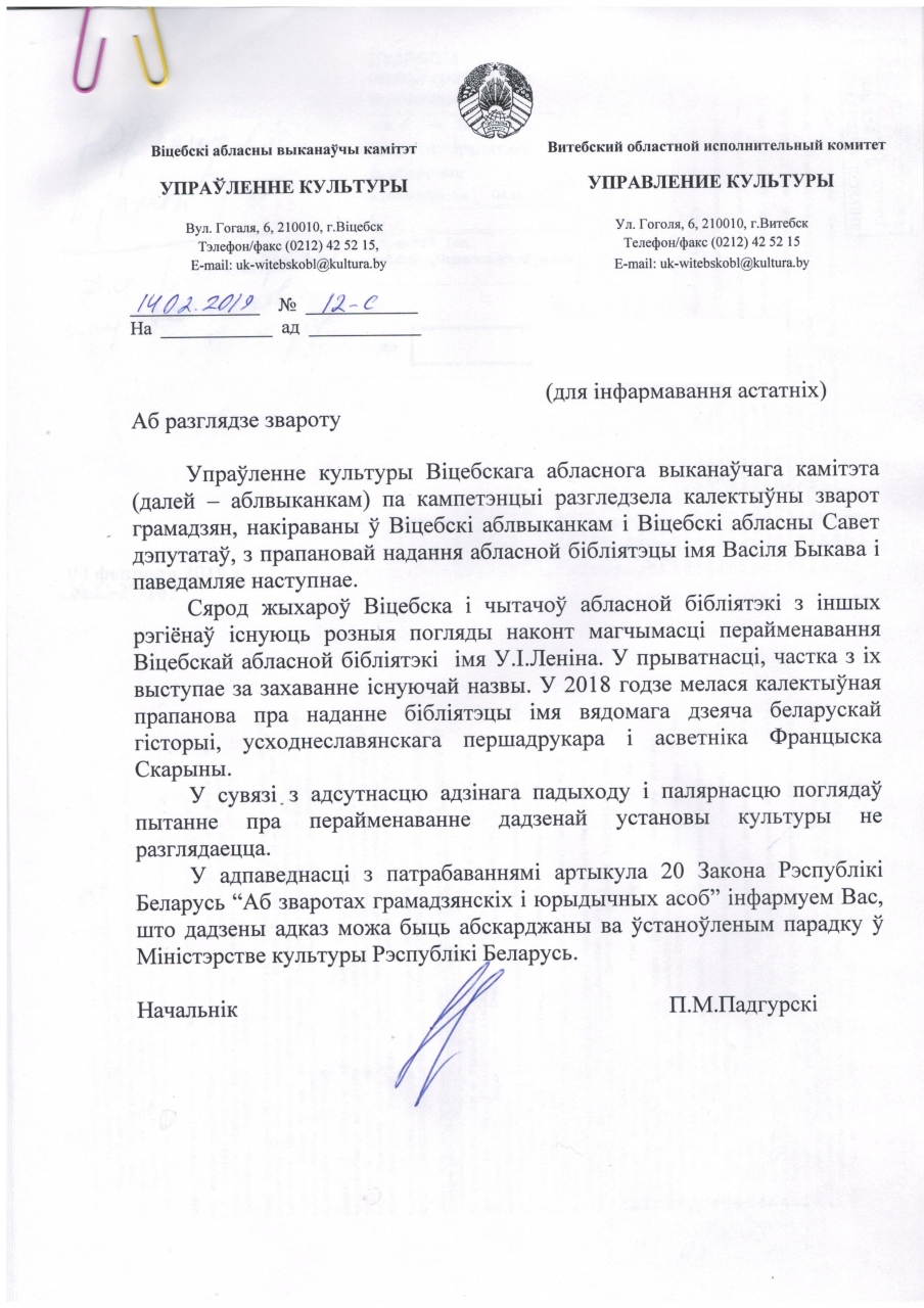 Мы, жыхары горада Віцебска і прадстаўнікі іншых рэгіёнаў, канстатуем, што імя У.І. Леніна, якое носіць адна з галоўных установаў культуры Віцебскай вобласці – абласная бібліятэка, -- не адпавядае часу, не з’яўляецца нацыянальна апраўданым і значным.