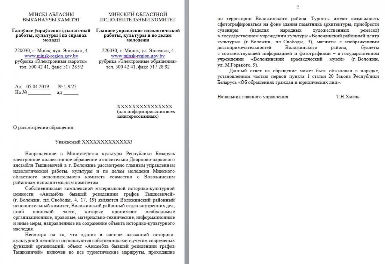 Ансамбль бывшей резиденции графов Тышкевичей, 1782 – 1806» внесен в Государственный список историко-культурных ценностей Республики Беларусь, составлен паспорт, собственниками подписаны охранные обязательства.