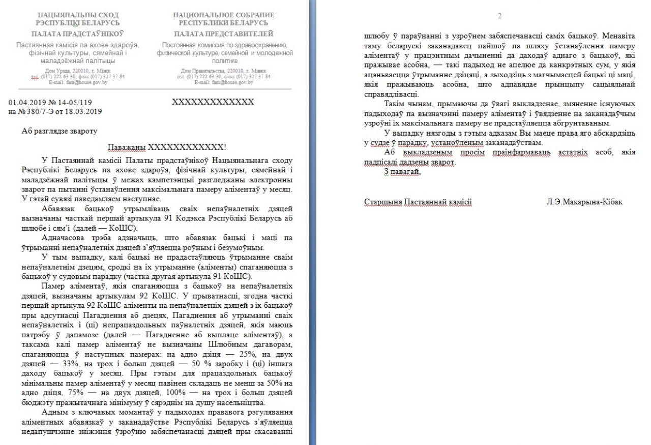 У сувязі з вышэй напісаным, каб ажыццявіць абарону бацькоў, якія выплочваюць аліменты, прапануем унесці змяненні у артыкул 92 кодэкса аб шлюбе і сям'i і адзначыць максімальны памер выплочваемых аліментаў напрыклад у 300-400 бел.руб (на студзень-люты 2019 г.), прывязаўшы разлічваемую суму да бюджэта пражытачнага мінімума у памеры напрыклад 150%.