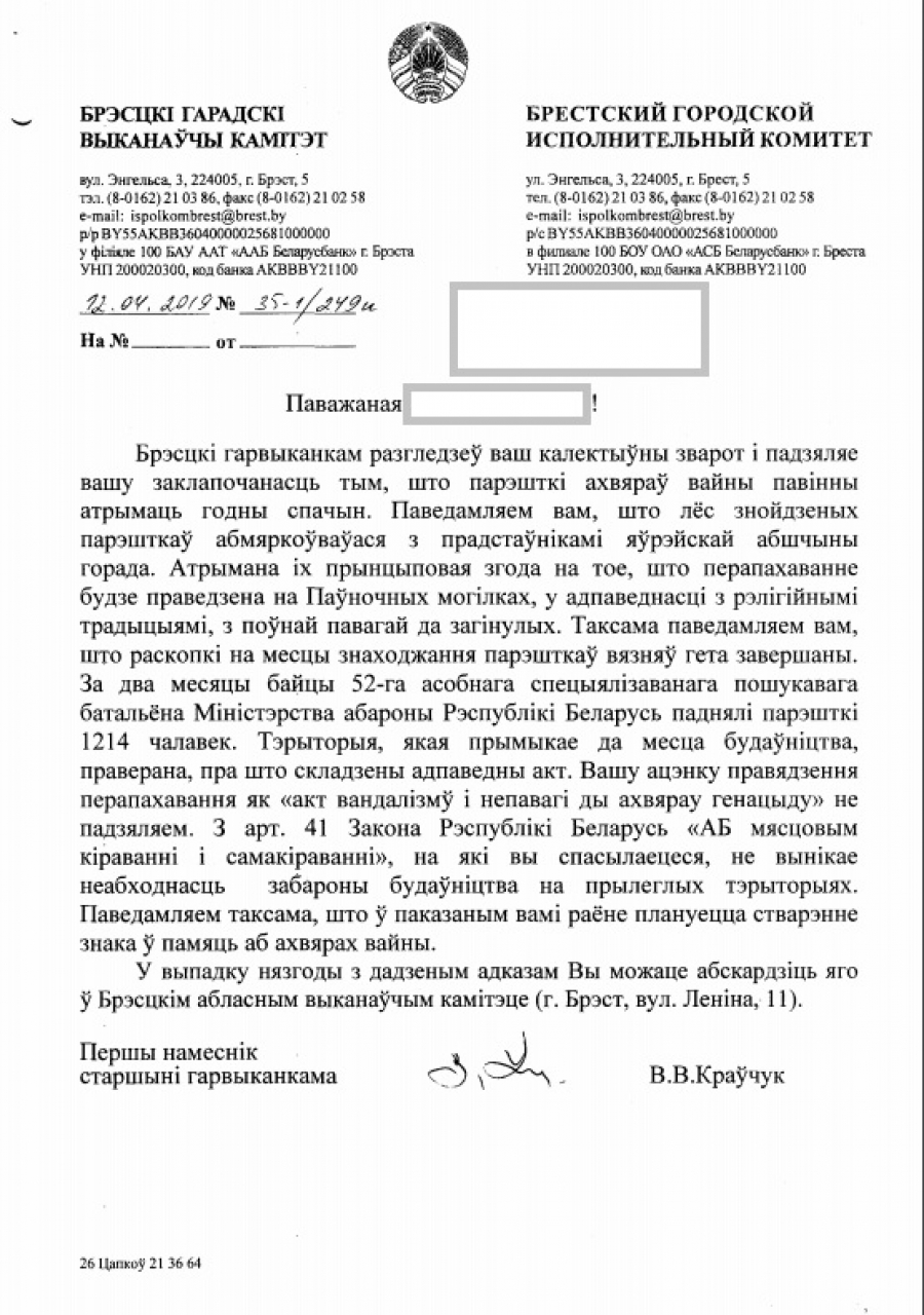 На падставе арт. 41 Закона "Аб мясцовым кіраванні і самакіраванні», які ўсталёўвае, што выканкамы вырашаюць пытанні размяшчэння аб'ектаў будаўніцтва на адпаведнай тэрыторыі, патрабуем зЗабараніць забудову на месцы масавых растрэлаў.